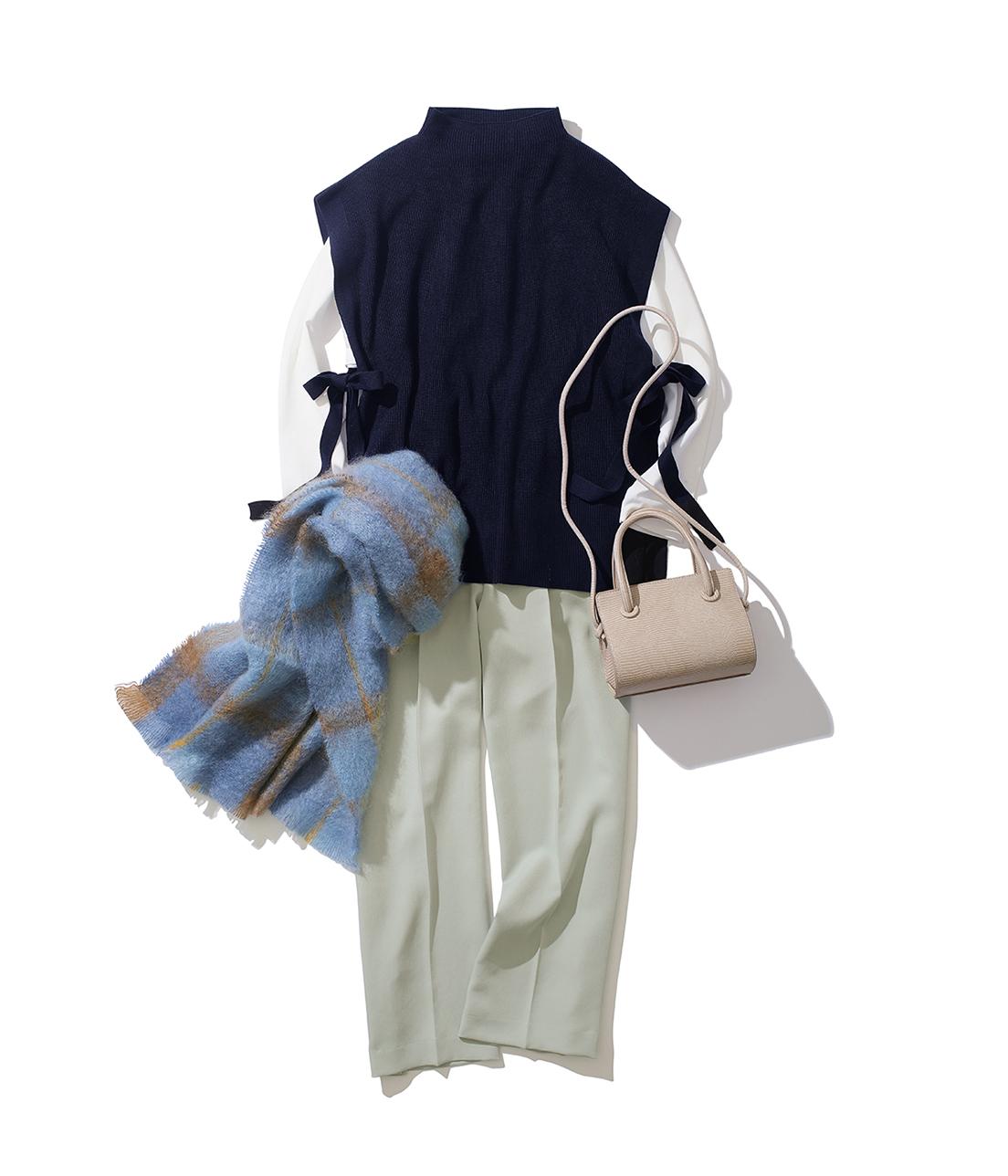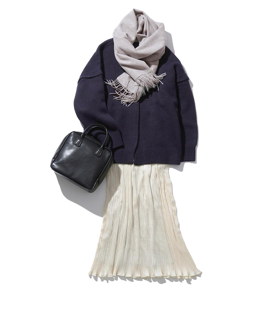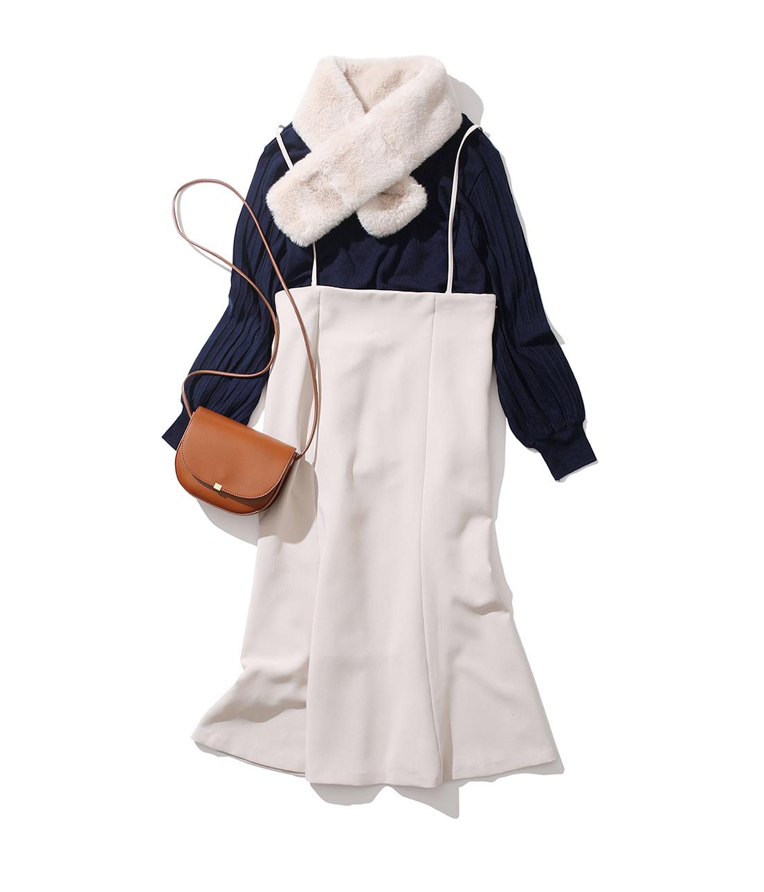 落ち着いた印象のネイビーのニットに女性らしいシルエットのマーメイドスカートとティペットを合わせて華やかな印象に。後ろ姿もかわいいバックリボンニット。