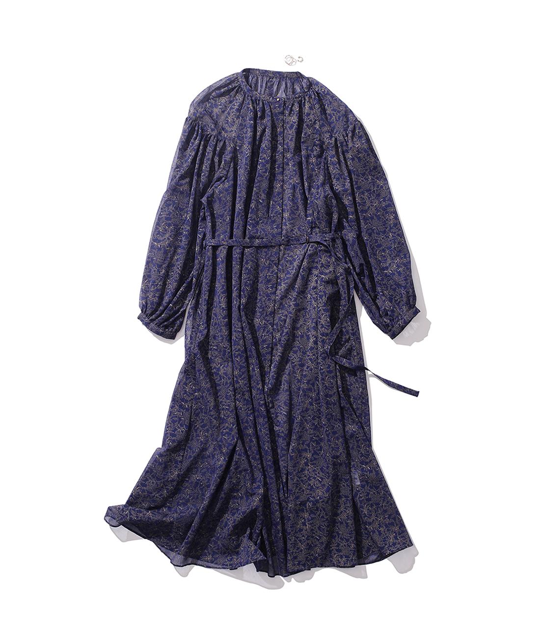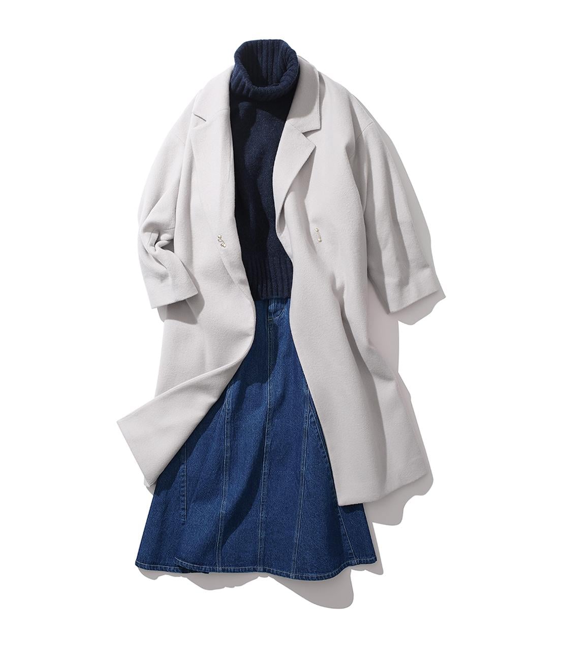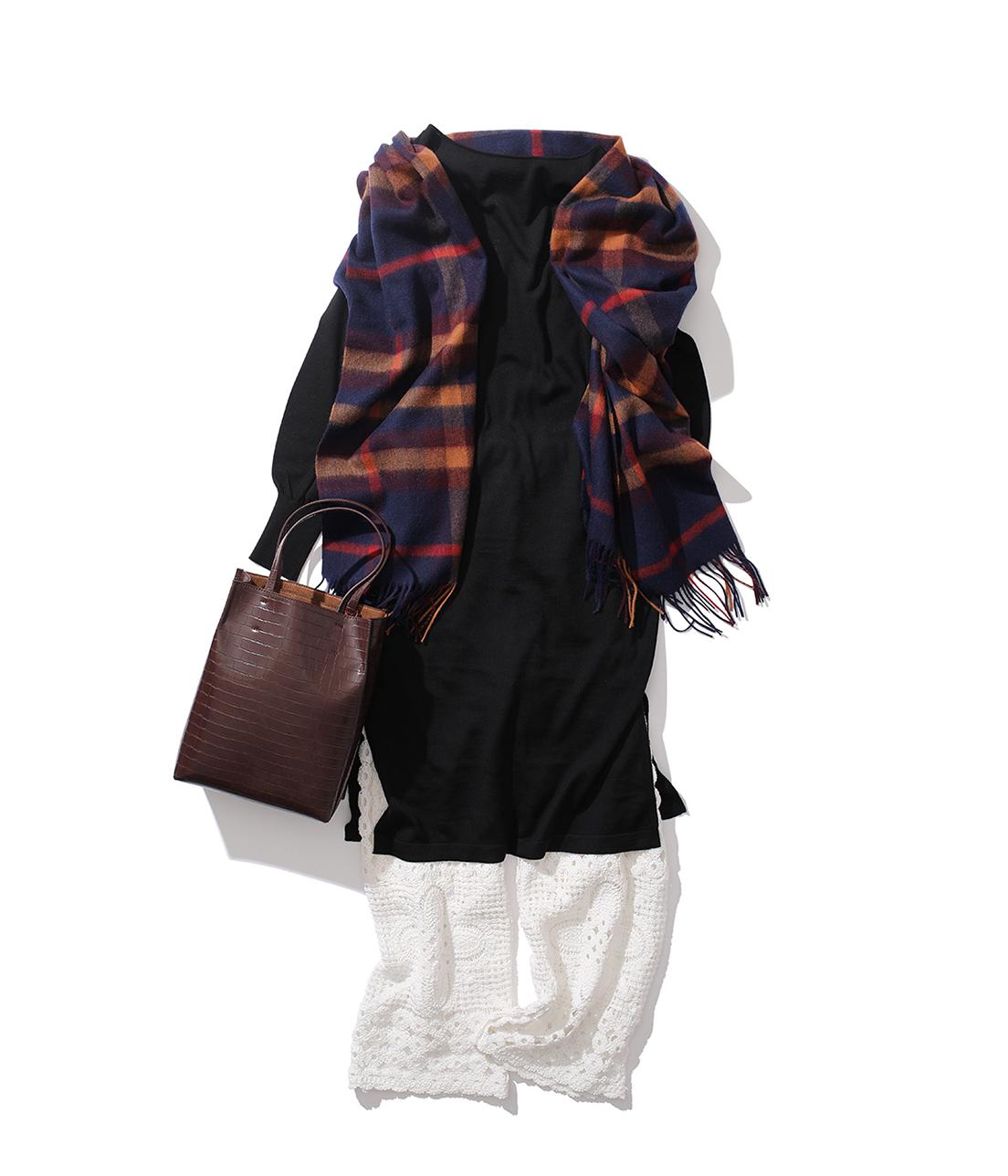 落ち着いた印象のネイビーのニットに女性らしいシルエットのマーメイドスカートとティペットを合わせて華やかな印象に。後ろ姿もかわいいバックリボンニット。