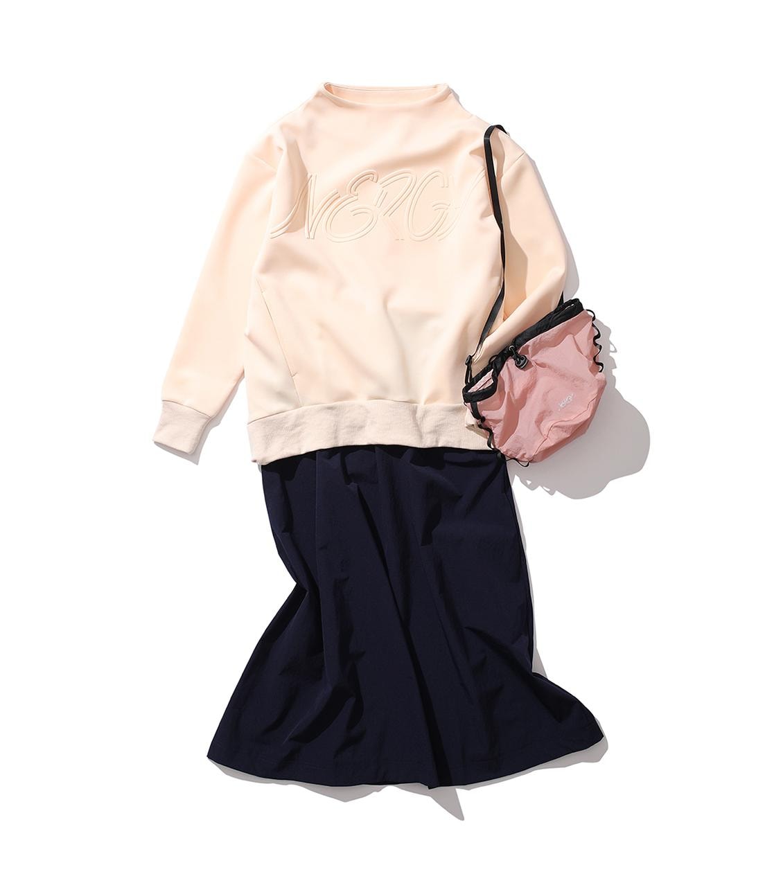 ナイロンスカートもダークカラーなら上品見え。オーバーシルエットのスウェットが可愛いカジュアルコーデ。