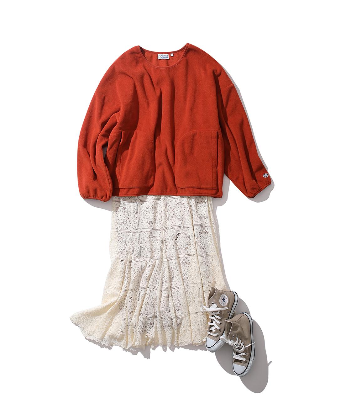 明るさを感じるオレンジ色のフリースにプリーツスカートを合わせて大人かわいいカジュアルスタイル。