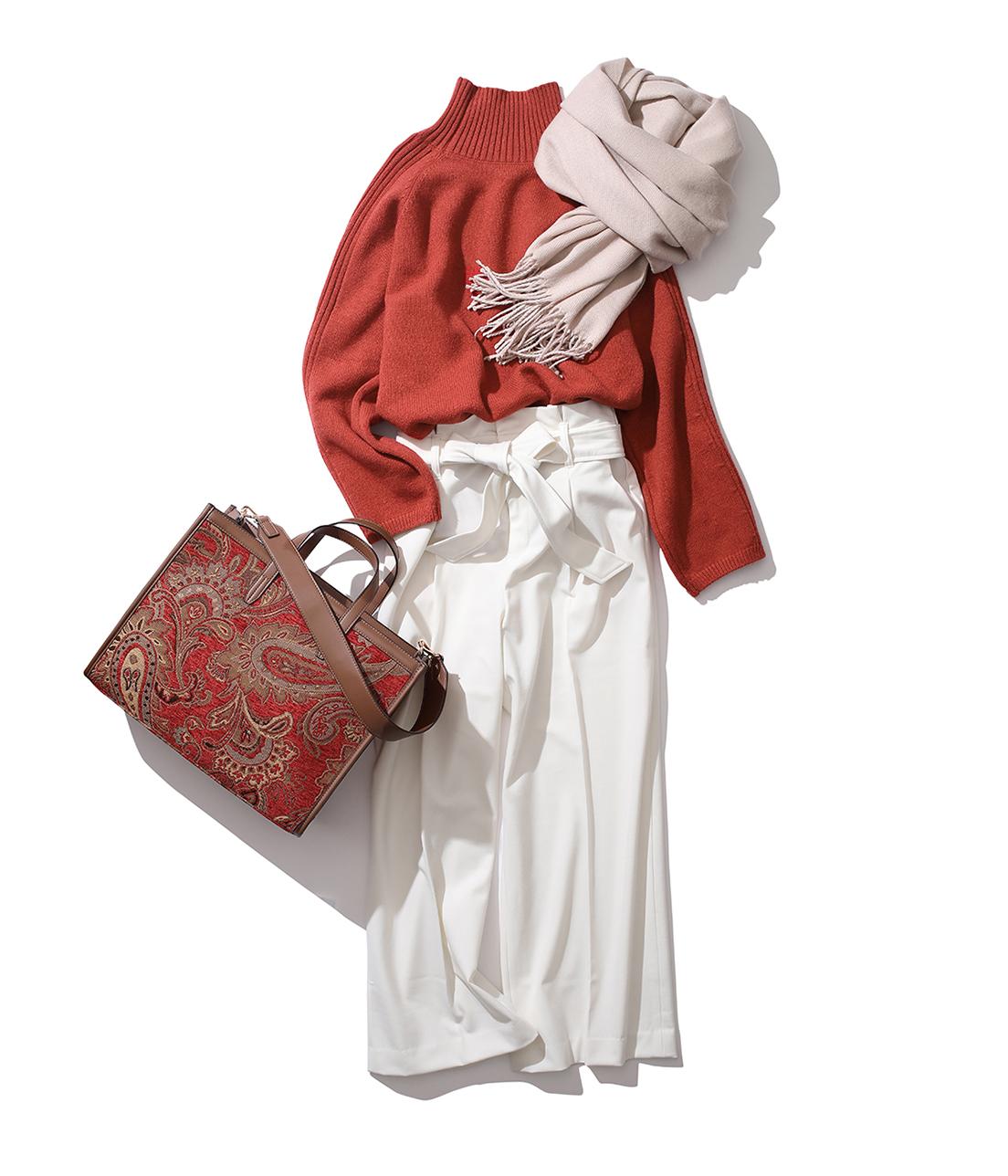 ハイウエストでハンサムなスタイリングに赤が効いたコーデ。
