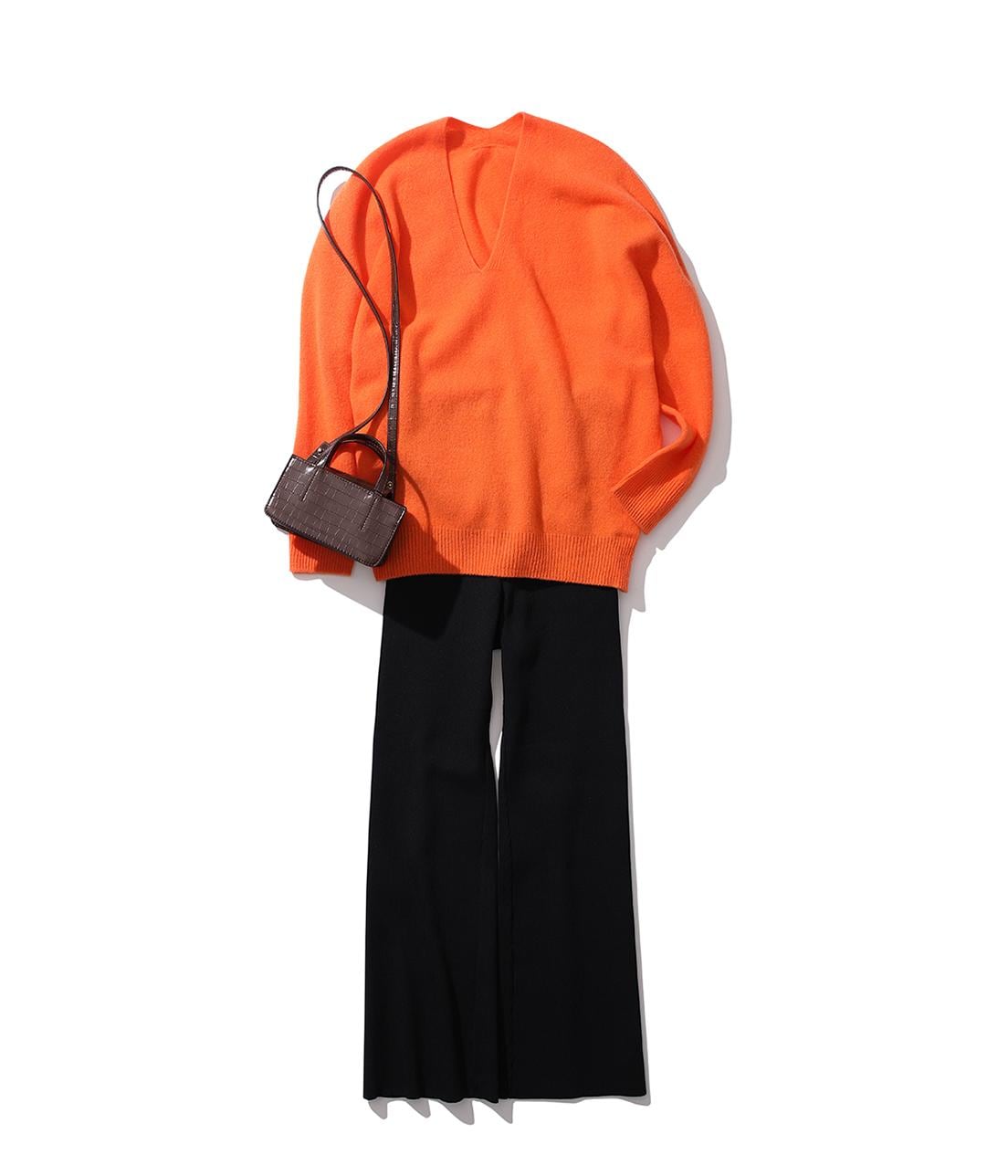 ぱっと目を引く鮮やかなオレンジ色が主役。シアーニットをインナーにして透け感を楽しむ春コーデ。