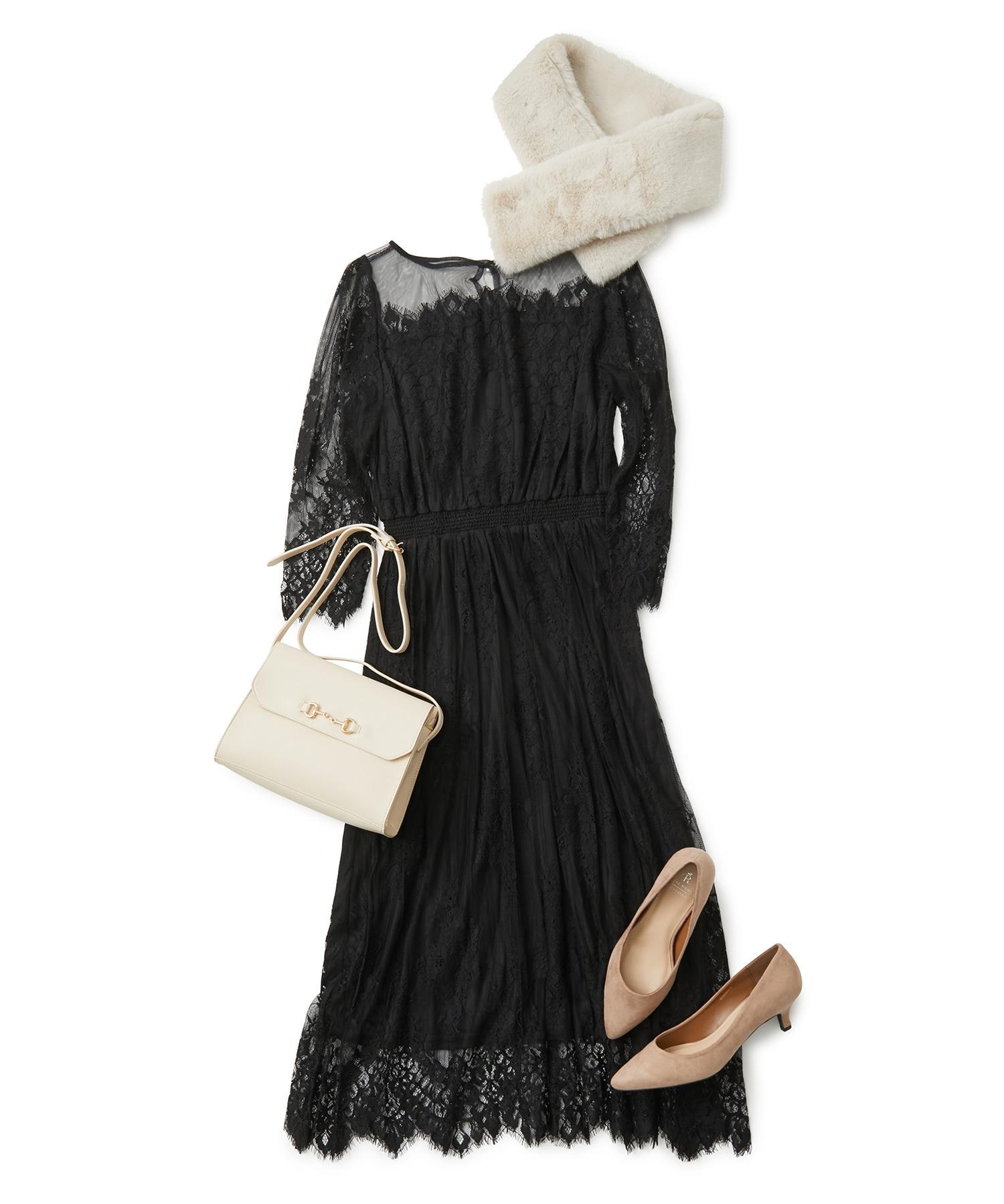 シックな印象のブラックのドレスには、蠍座のラッキーカラーのホワイトの小物合わせで上品な印象に。