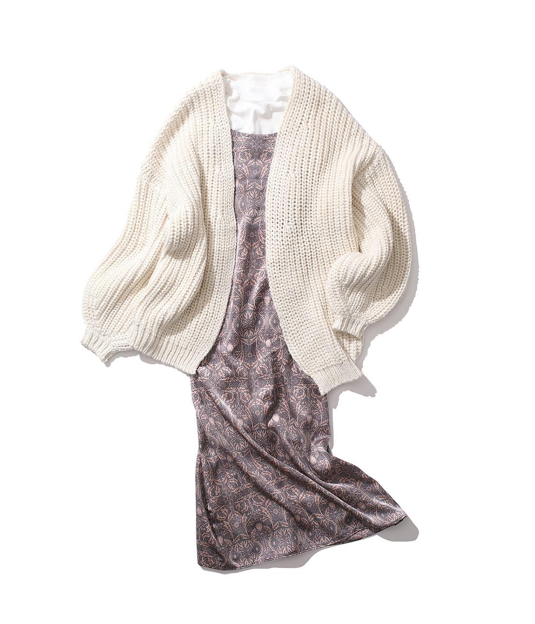 色気のあるざっくり白ニットカーデのリラックススタイル。