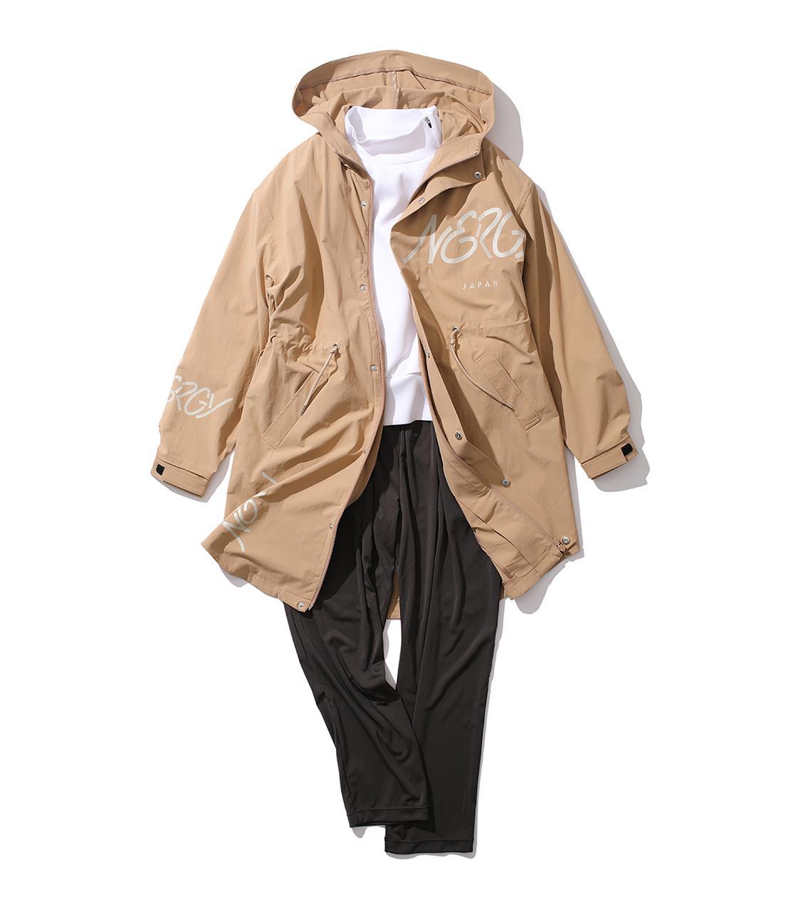 ミリタリーなモッズコートのインナーに、潔い白トップスをプラスした清潔感のあるアスレジャースタイル。