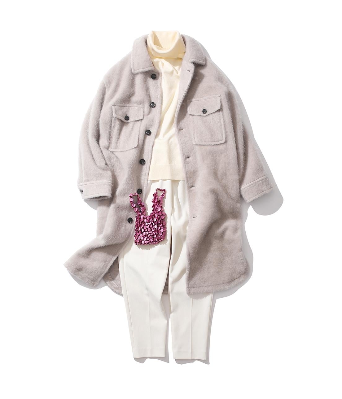 人気のシャギーコートをまとったホワイトコーデには、ピンクのバッグでポイントをつけて!