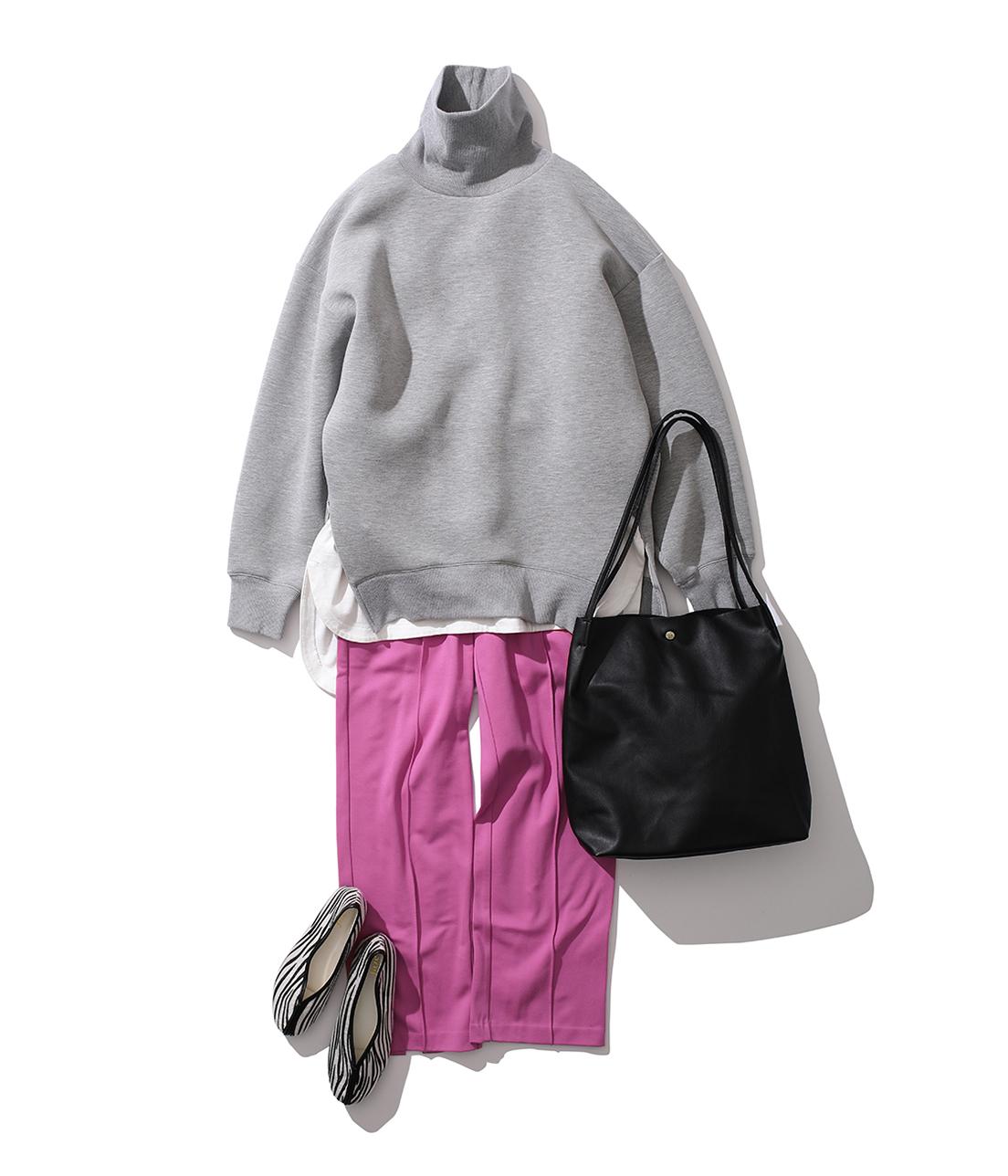 甘くなりがちなピンクは、小物にエッジを利かせて大人カジュアルに。