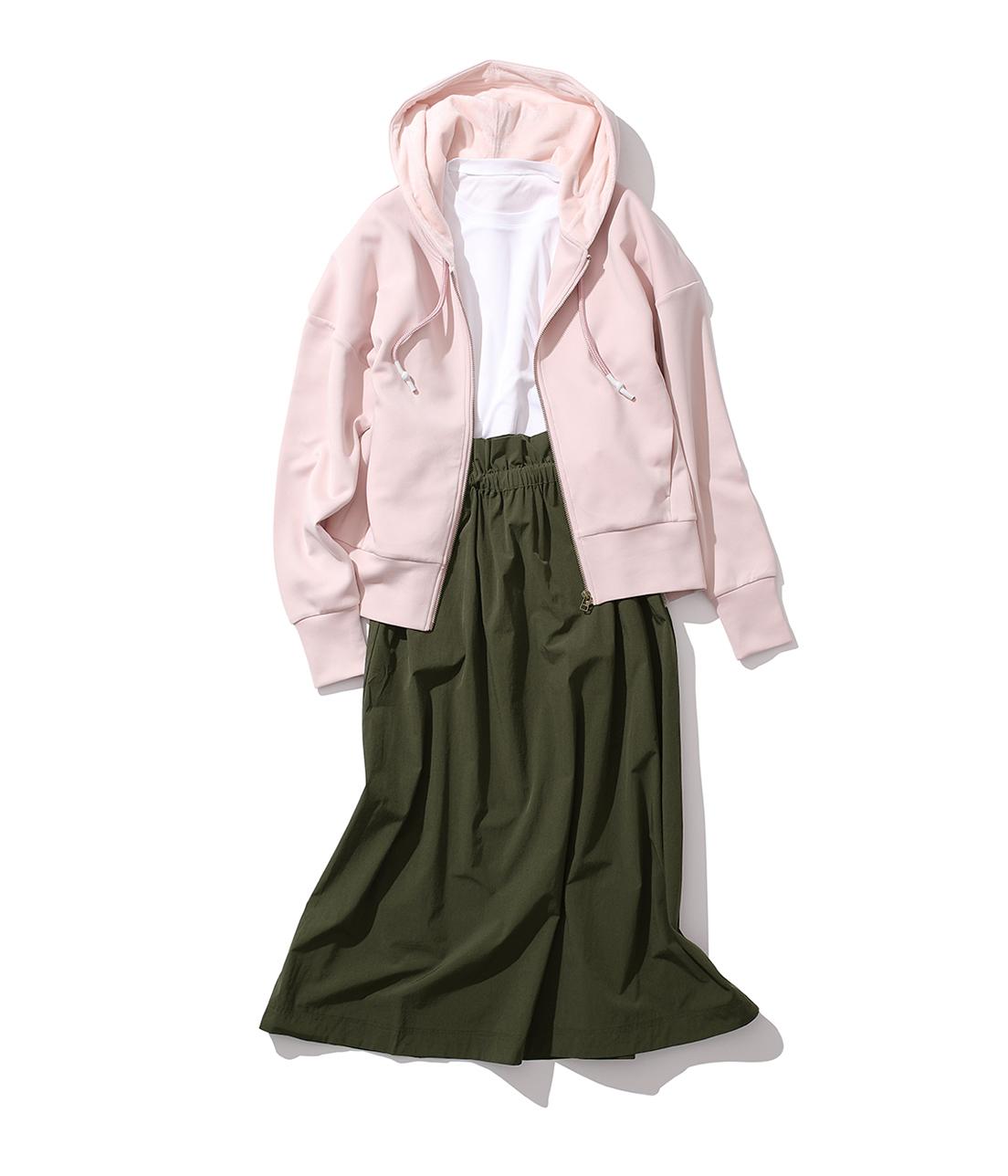 パウダーピンクを主役にしたナチュラルかわいい大人のカジュアルスタイル。ボトムには印象を引き締めるミリタリーカーキをチョイス。