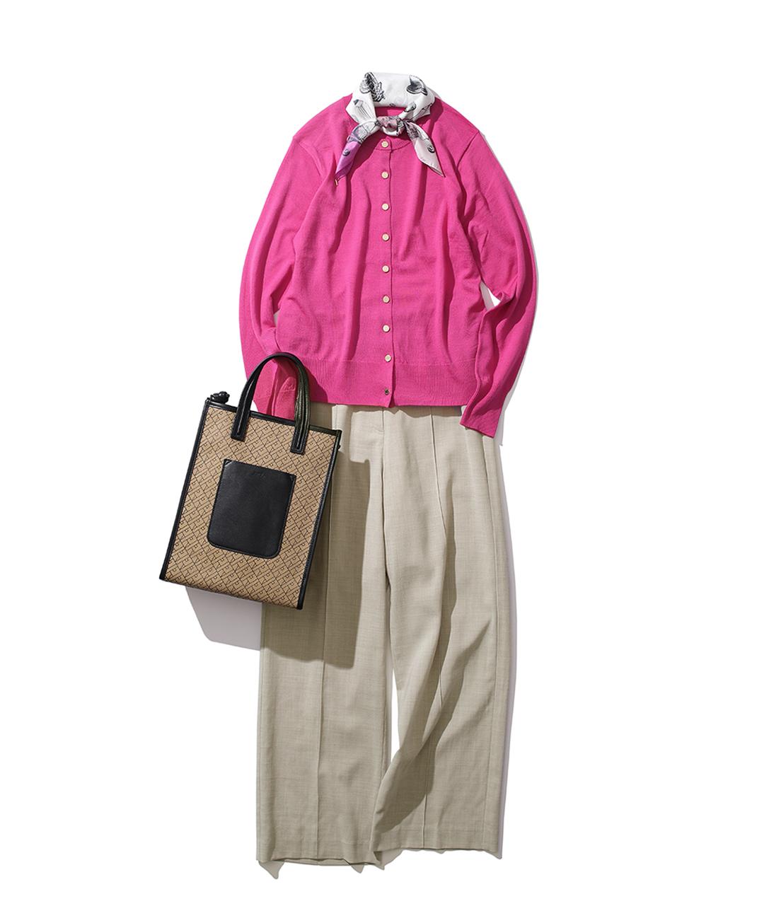 ベーシックなシルエットのカーディガンをハンサムな着こなしとバッグで。