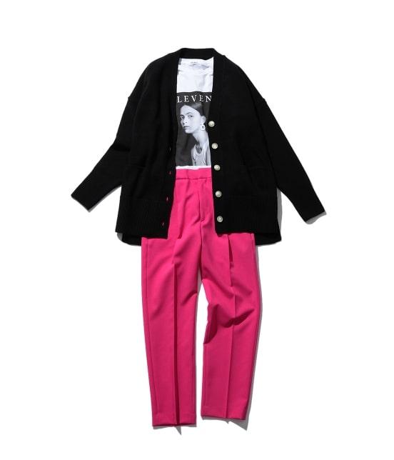 ラフなアイテムにパキッとピンクでかっこよく、アダムエロペらしいピンク使いこコーデ。