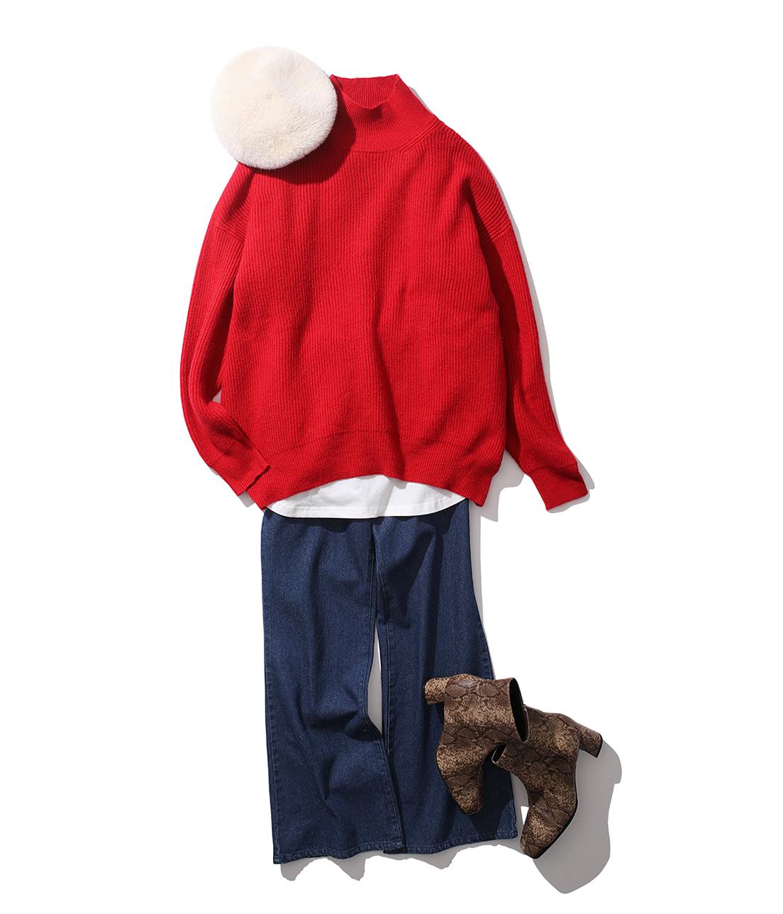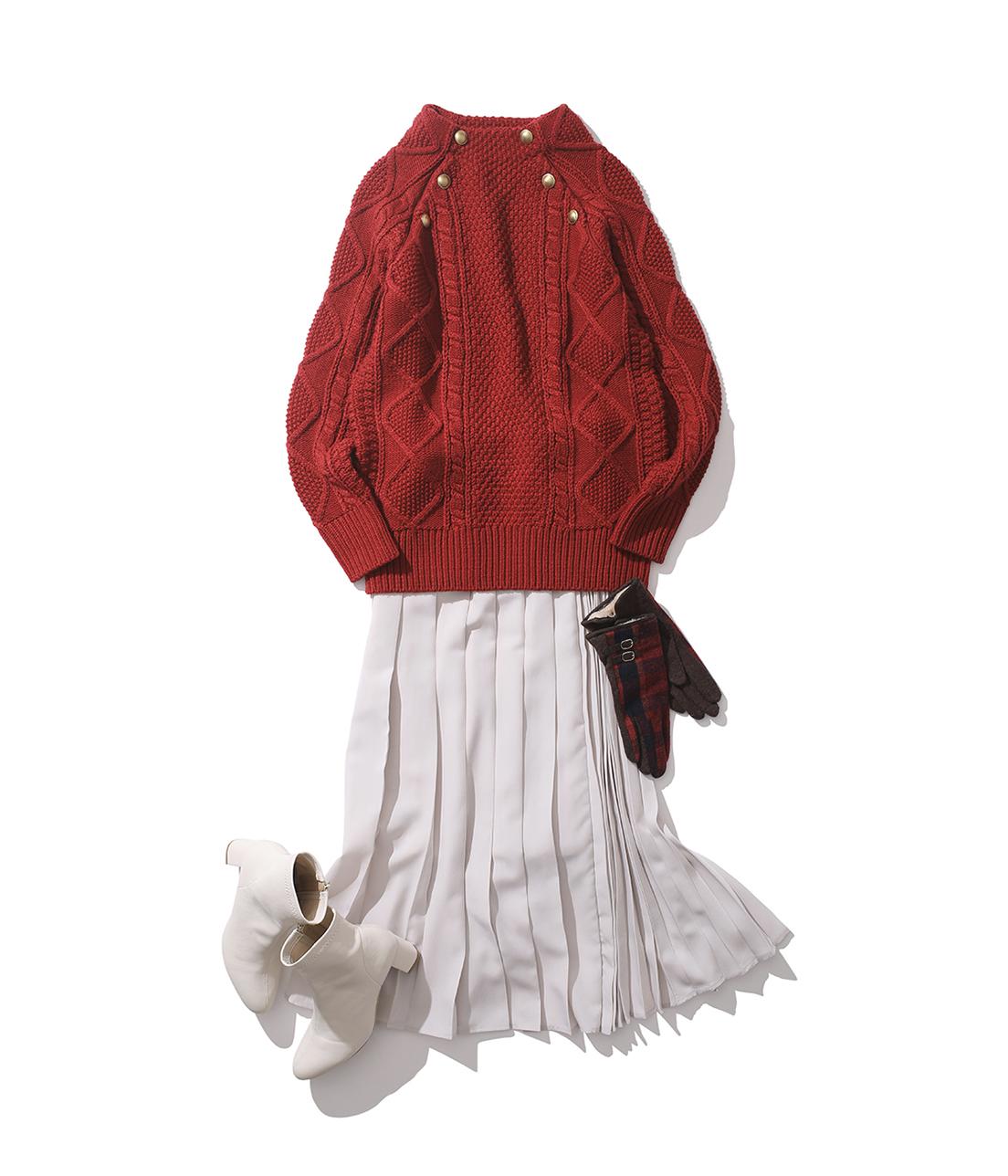 白のプリーツスカートとブーツには、エネルギッシュな赤色ニットとグローブで華やかさをプラス