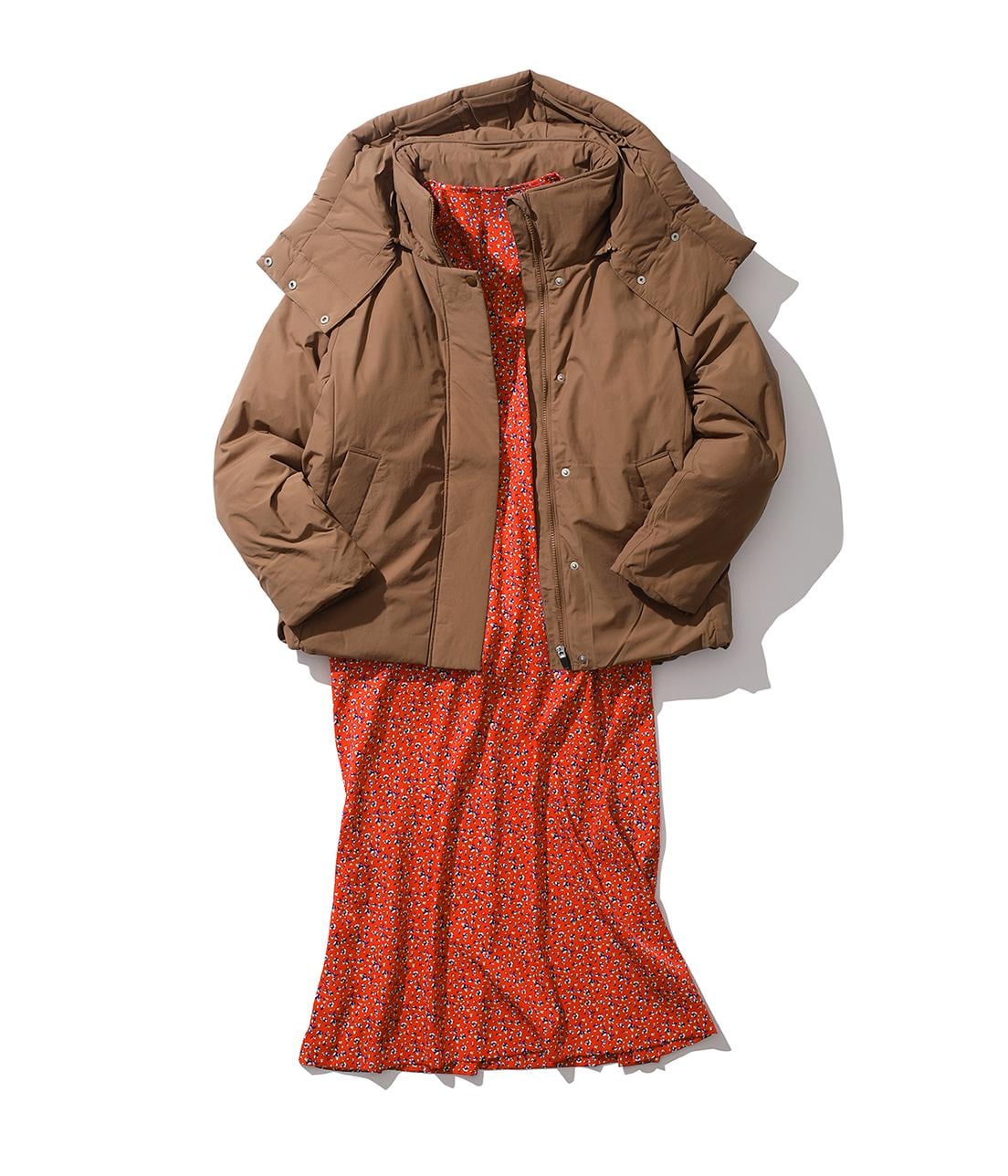 フェミニンなワンピにスポーティーなダウンが今年らしいスタイル。