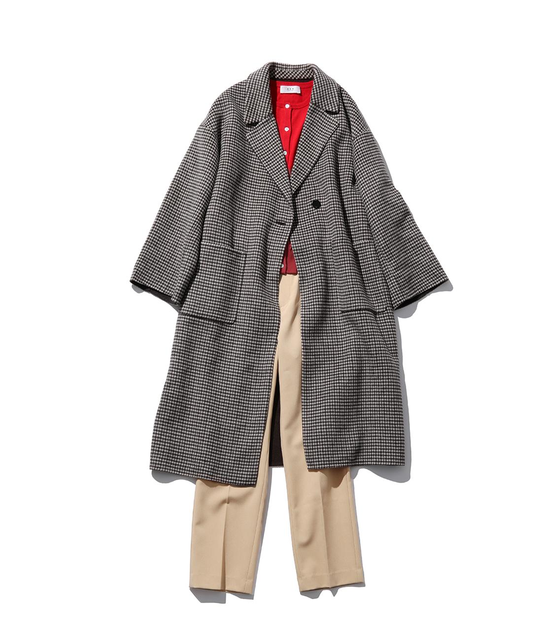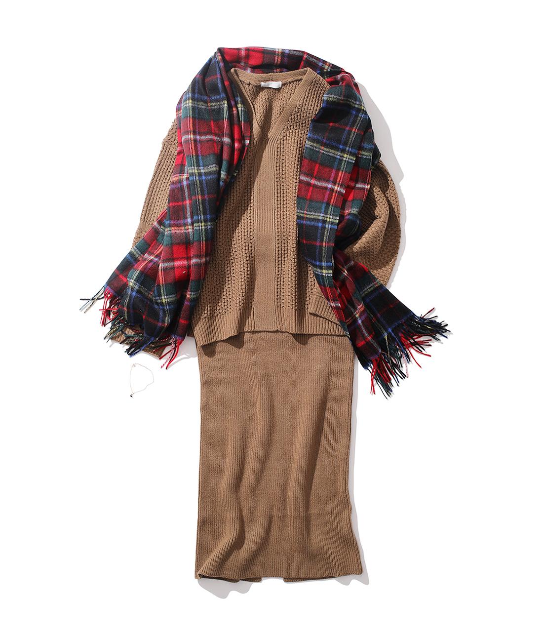 大人なニットのセットアップはデートに◎飾りすぎないチェックストールでカラーをプラス