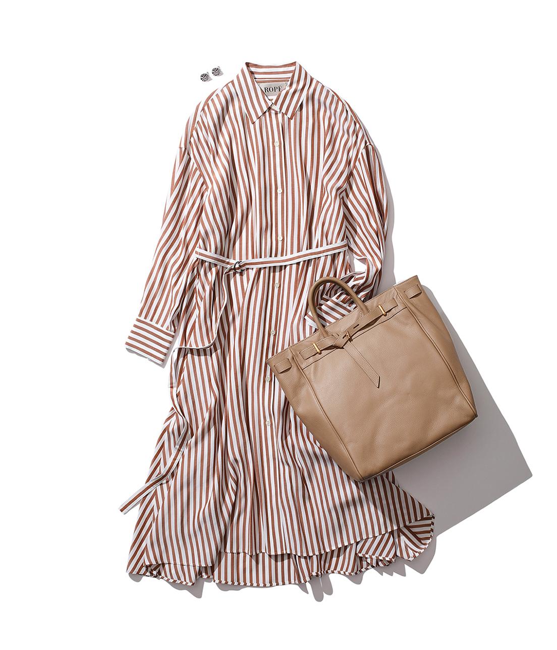 シャツワンピースはオールシーズン着まわせる万能アイテム。バッグは大人カラーで落ち着いた印象に。