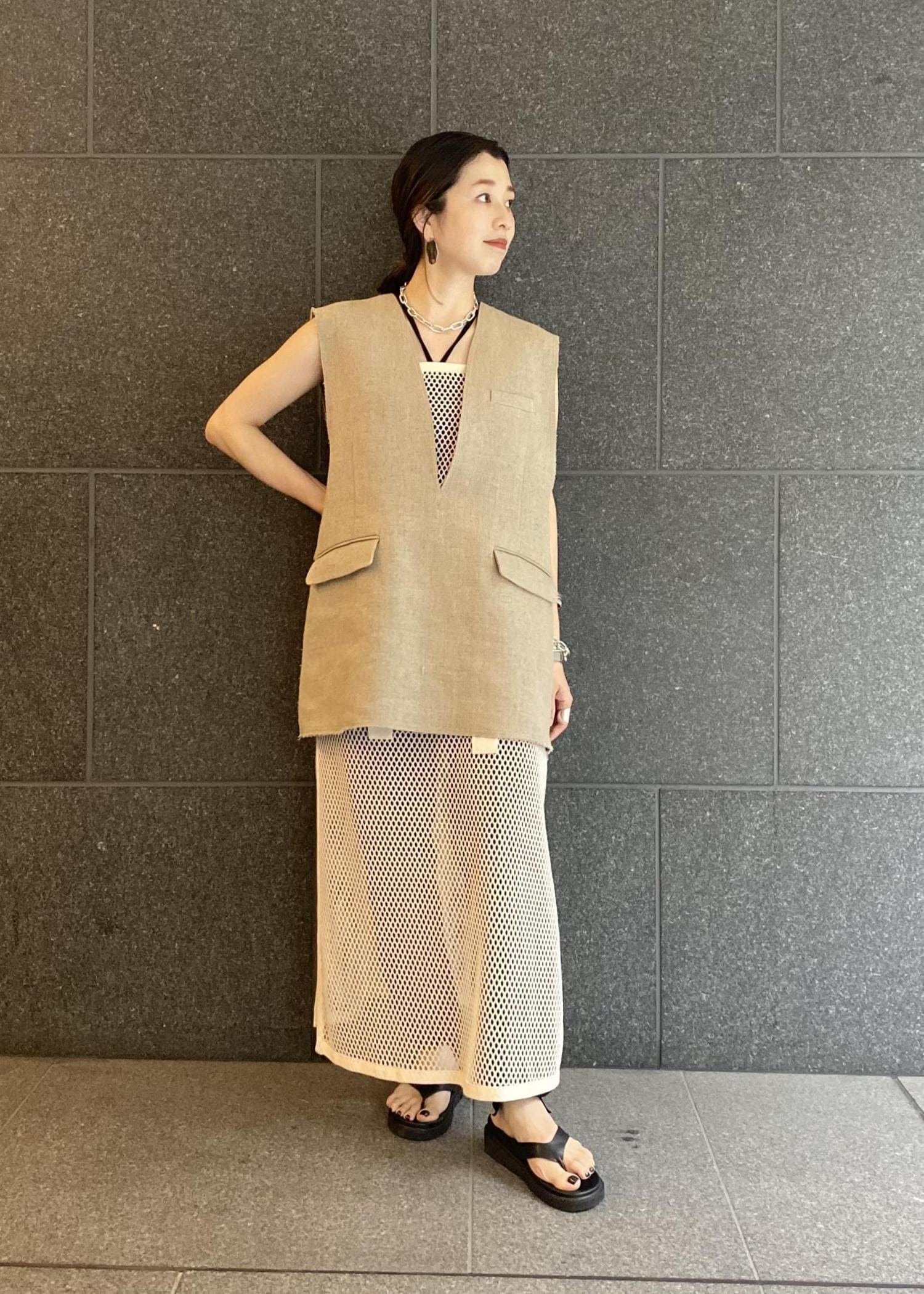 一見難易度の高そうなメッシュワンピースはパンツとのレイヤードが好相性。トレンドのベストを合わせることで立体感のあるコーデが楽しめます。同系色のニュアンスカラーにダークトーンの小物や存在感のあアクセサリーをプラスしシックにまとめるのが大人に着こなせるポイントです。