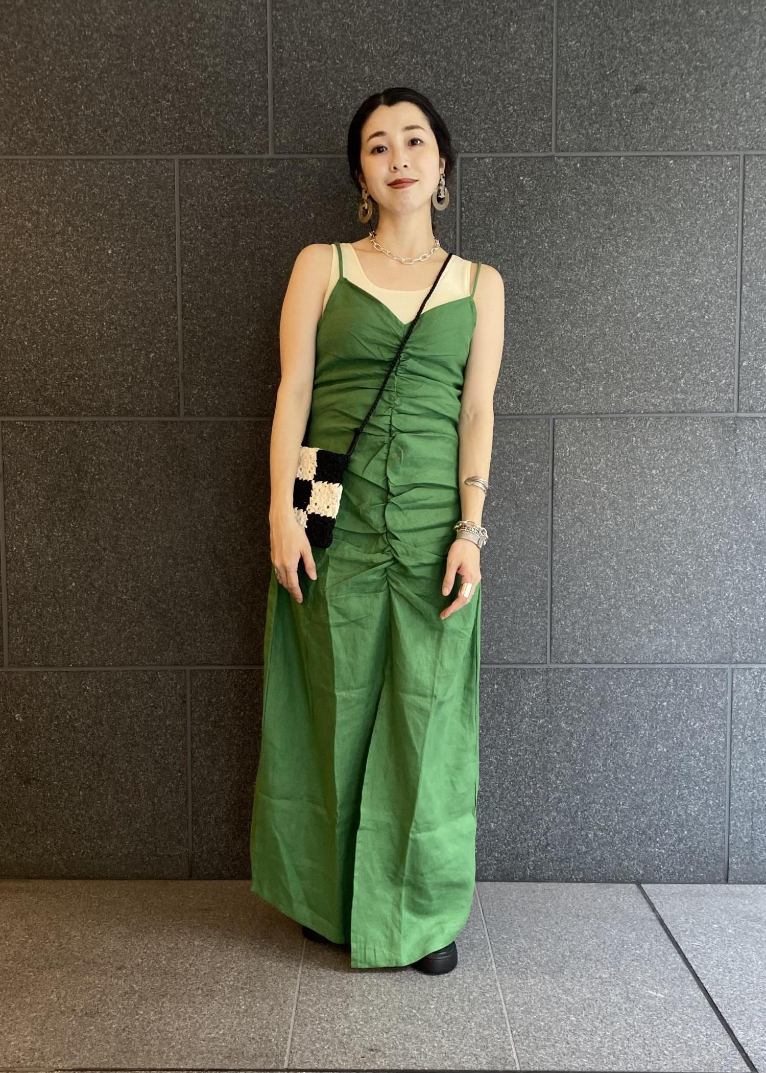 カラーとレイヤードで遊びを効かせた、夏のキャミワンピコーデ