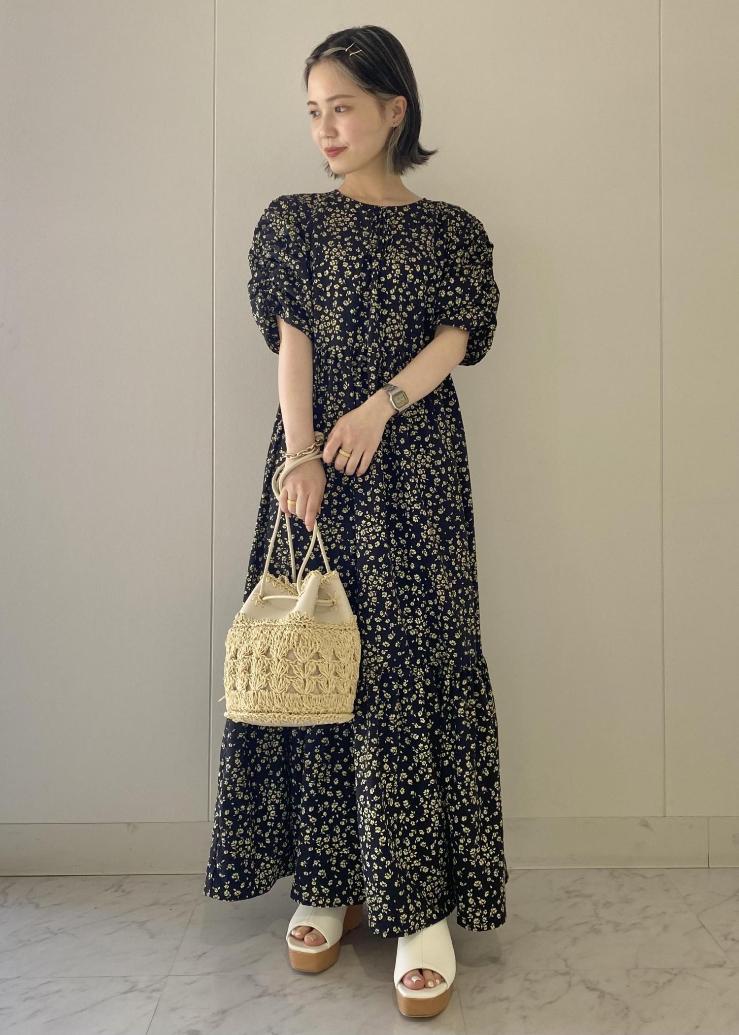 可愛らしい柄のワンピースは柄の甘さを色でシックに引き算を。ダークカラーにはナチュラル素材の小物で軽やかさをプラスすればコーデが重くなる心配もなし!