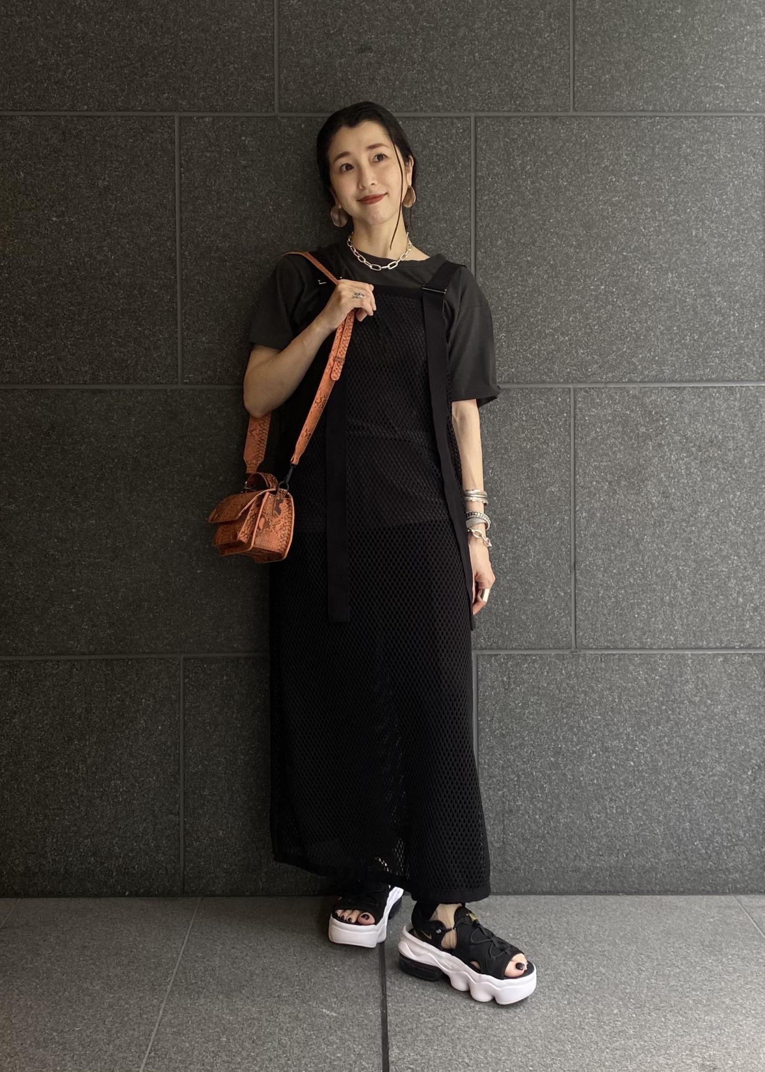 今注目のメッシュ素材のワンピース。ダークカラーのワントーンでまとめることでスッキリとコーデがまとまります。暑い夏にもレイヤードでおしゃれを楽しめます。足元は人気のスポサンでボリュームをプラスして。