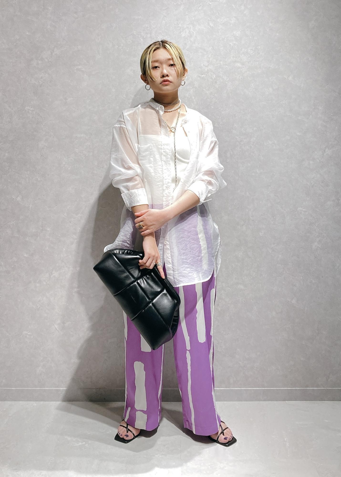 トレンドのシアーシャツにつないだのは大柄なブロッキングプリントのイージーパンツ。イージーな履き心地に加え脚長効果も抜群!