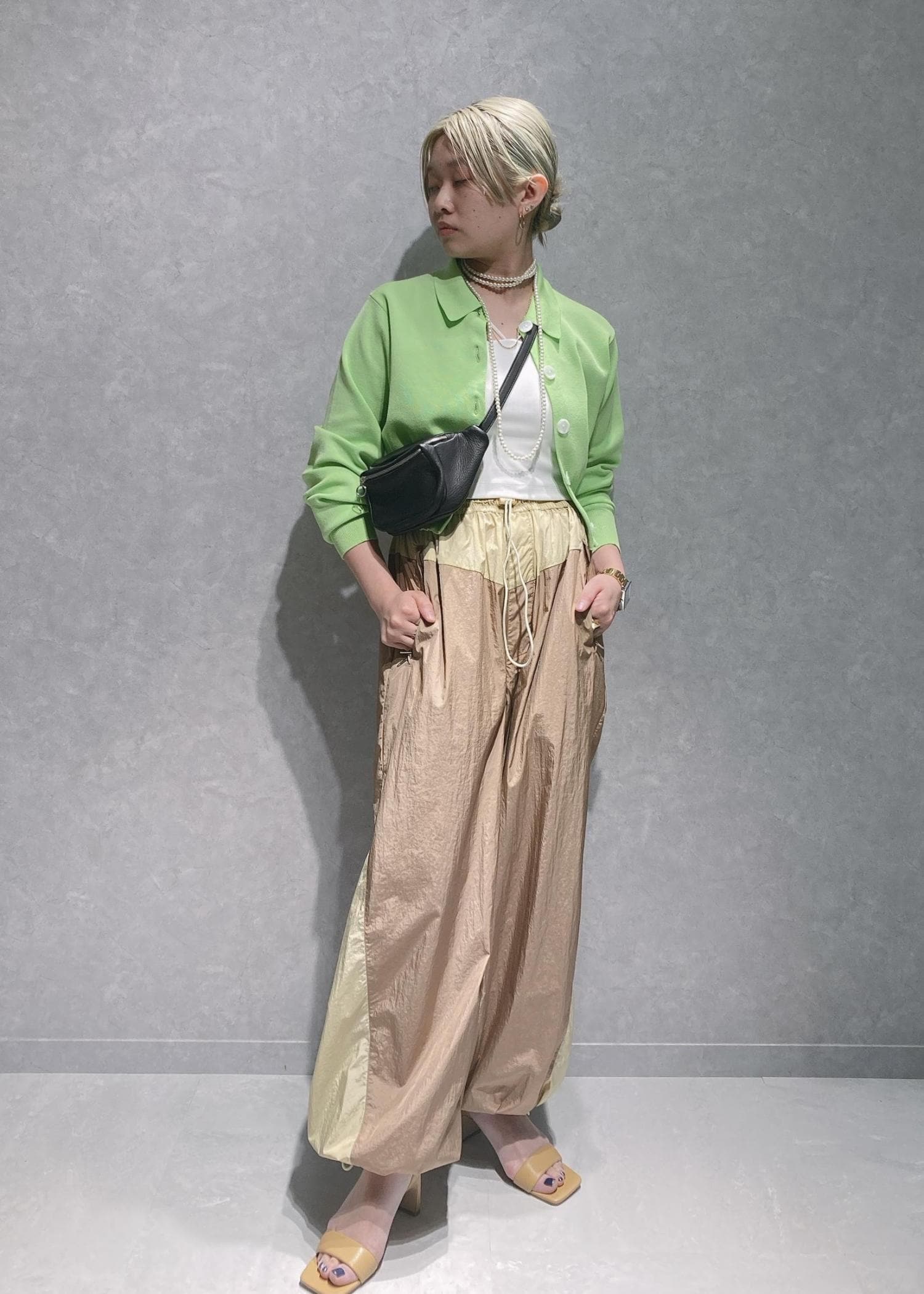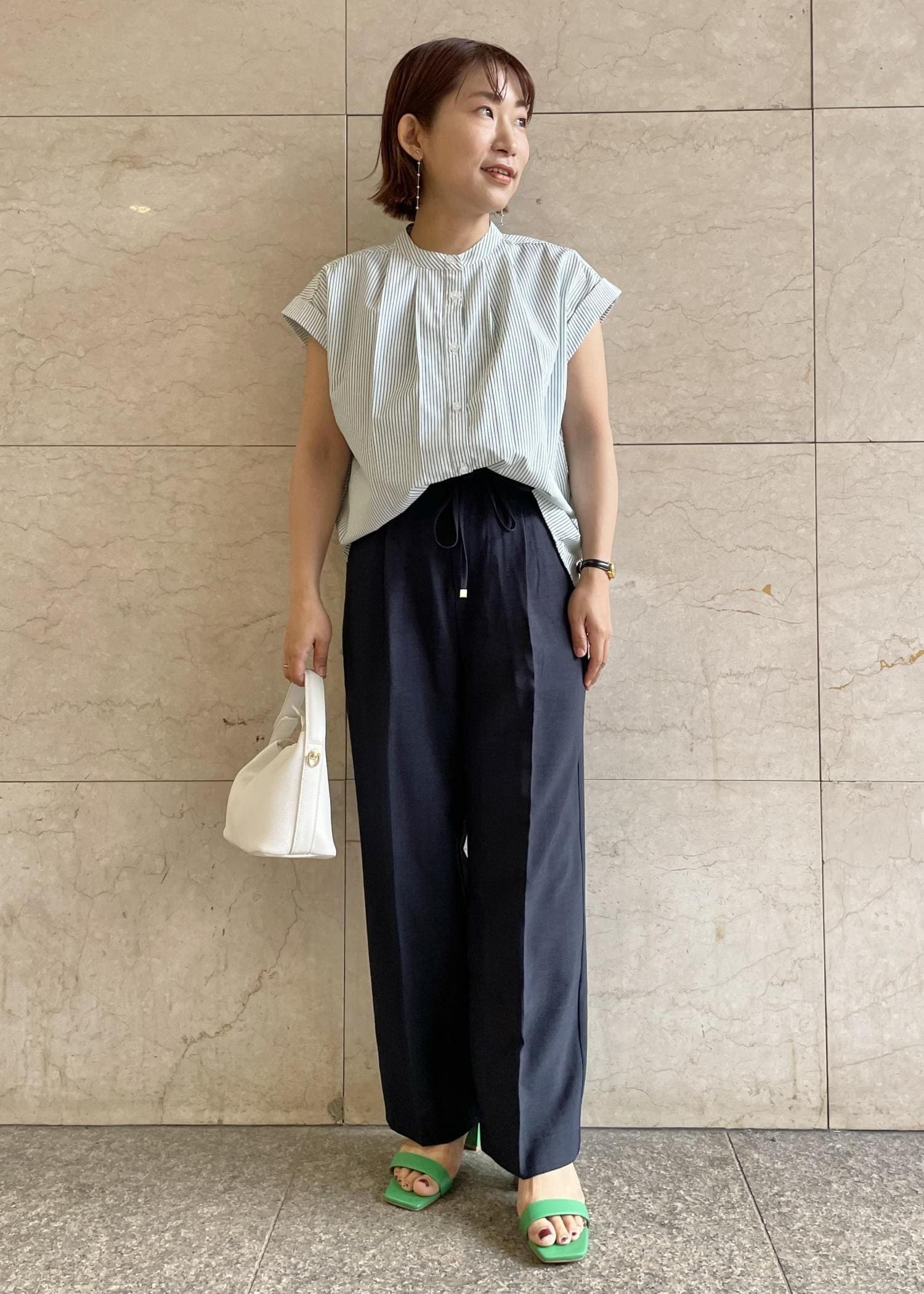 鮮やかな発色で季節感のあるグリーンのトップスで遊び心溢れるパンツコーデ