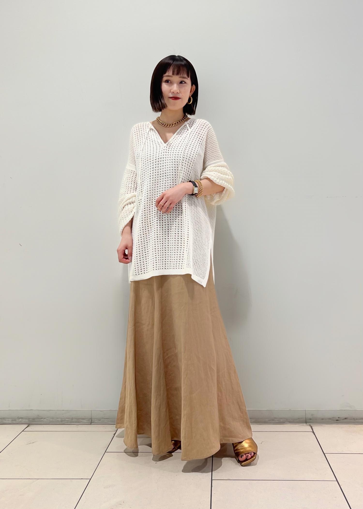 長めの着丈の透かし編みニットプルオーバーは気になるヒップ周りもカバーしてくれる優秀アイテム!キャメルのリネンロングスカートを合わせたナチュラルトーンコーデです◎