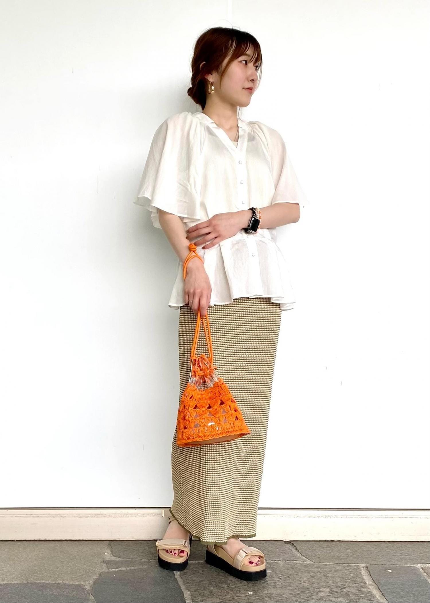 Vネックでお顔回りをすっきりと見せてくれるブラウスに、ヒップラインを拾いすぎない優秀ニットスカートを合わせて着痩せ効果抜群!アクセントに鮮やかなオレンジのバッグを♪