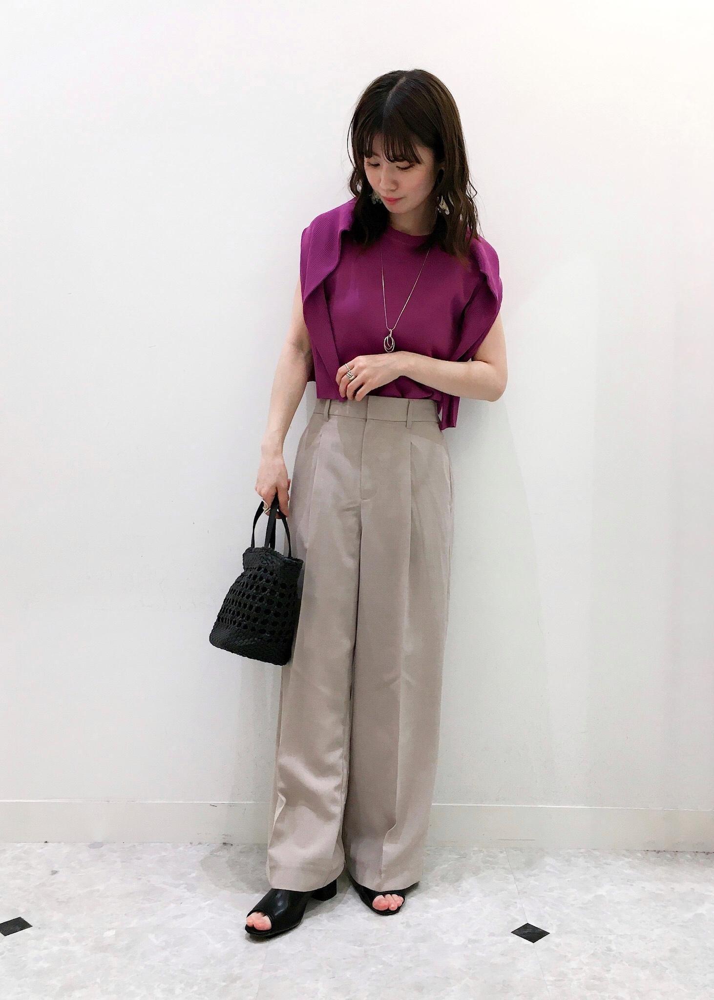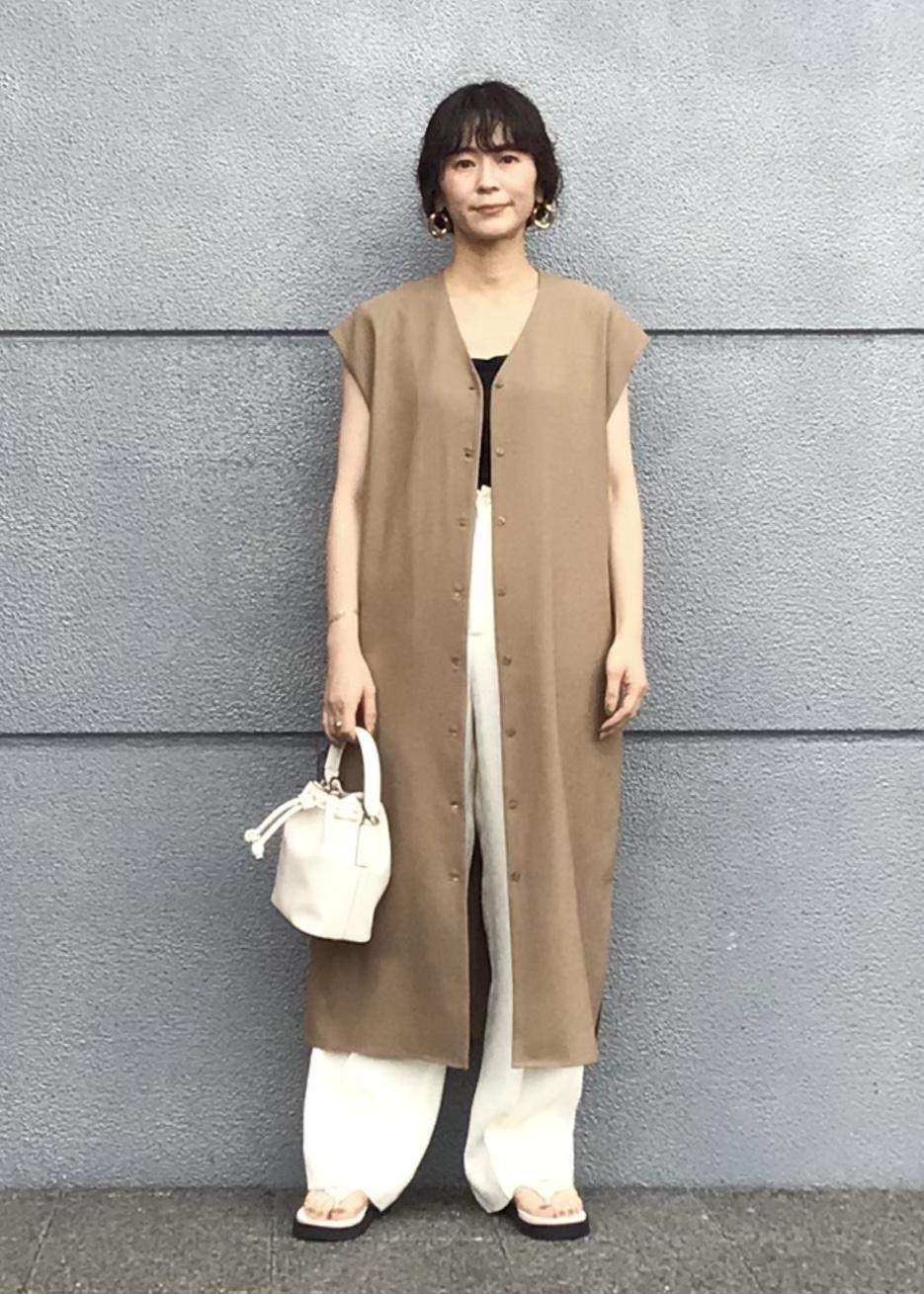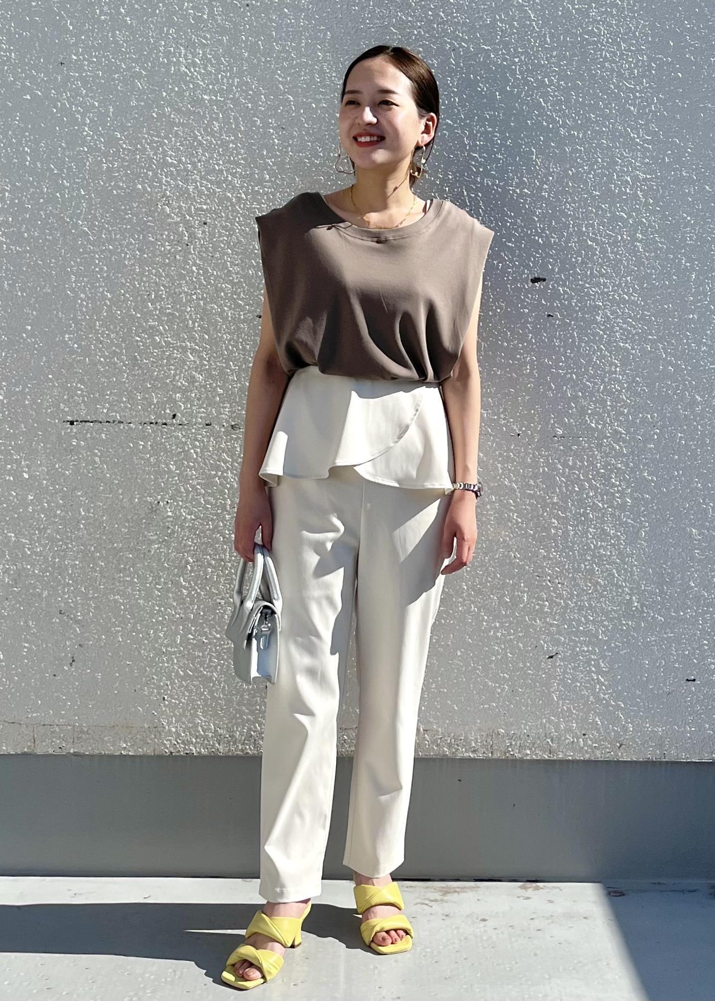 スリーブレスのデザインながらも二の腕を気にせず着こなせるブラウスに、着心地軽やかなのにスタイルアップも叶えてくれるイージーパンツ!柔らかな雰囲気漂う大人コーデ。