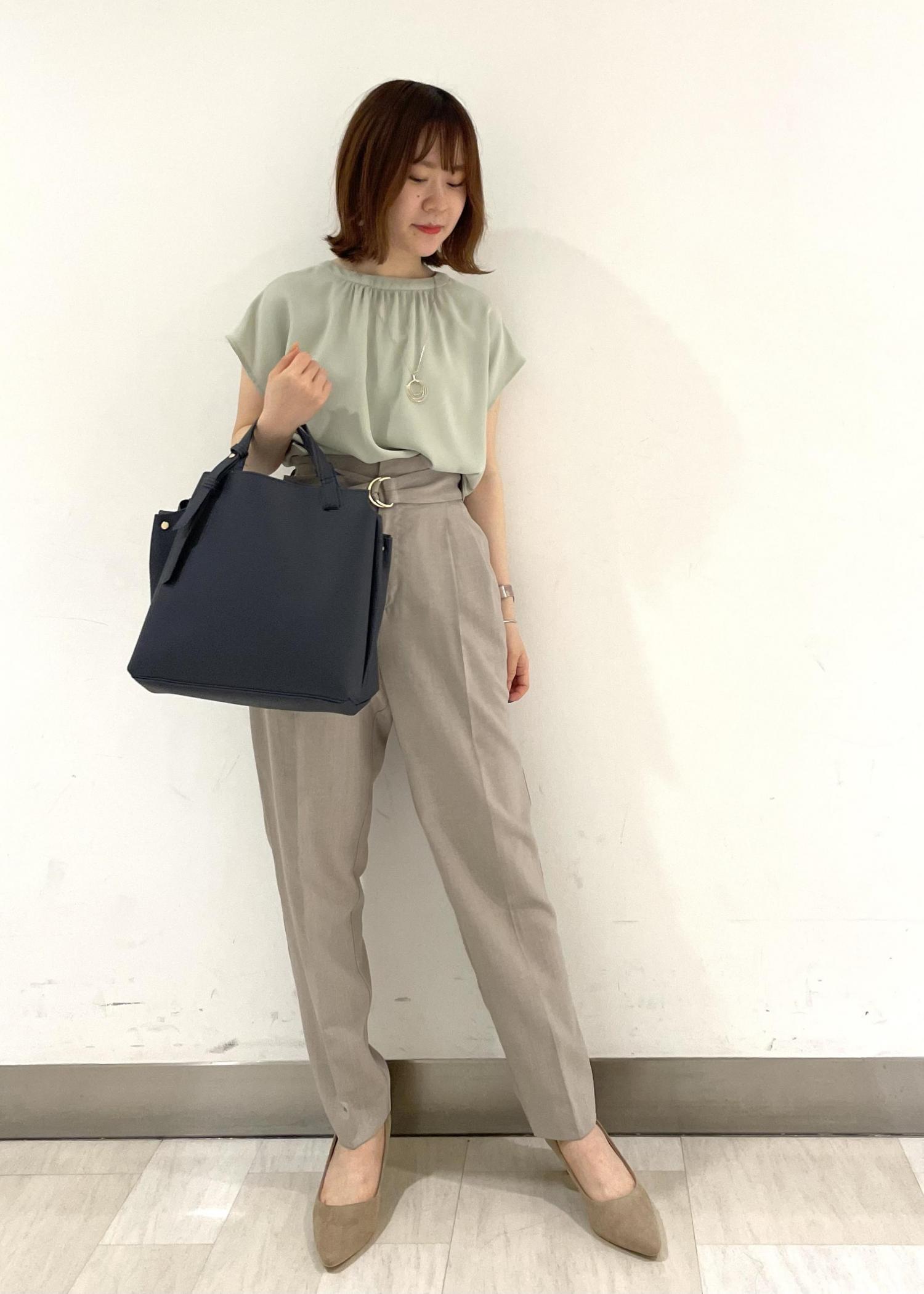 ライトグリーンとベージュの爽やかな色合わせ!トップスにはきれい色を合わせ、ハイウエストテーパードで脚長効果抜群です◎