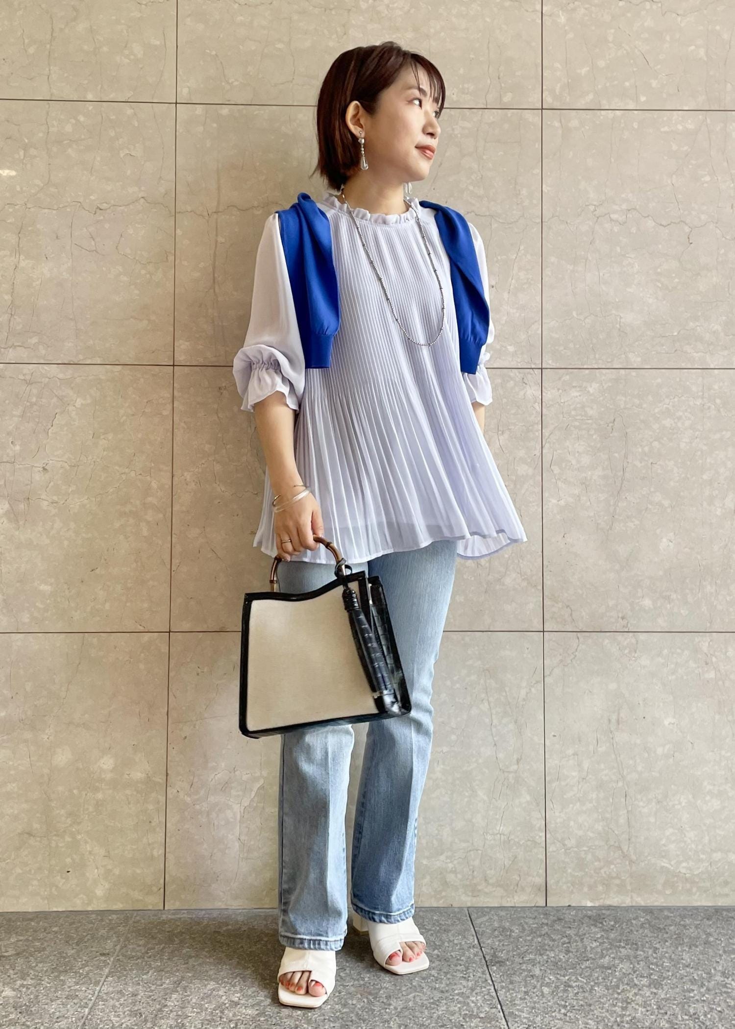 爽やかな色味の夏コーデ!カーデをラフに肩掛けするこなれテクニック♪