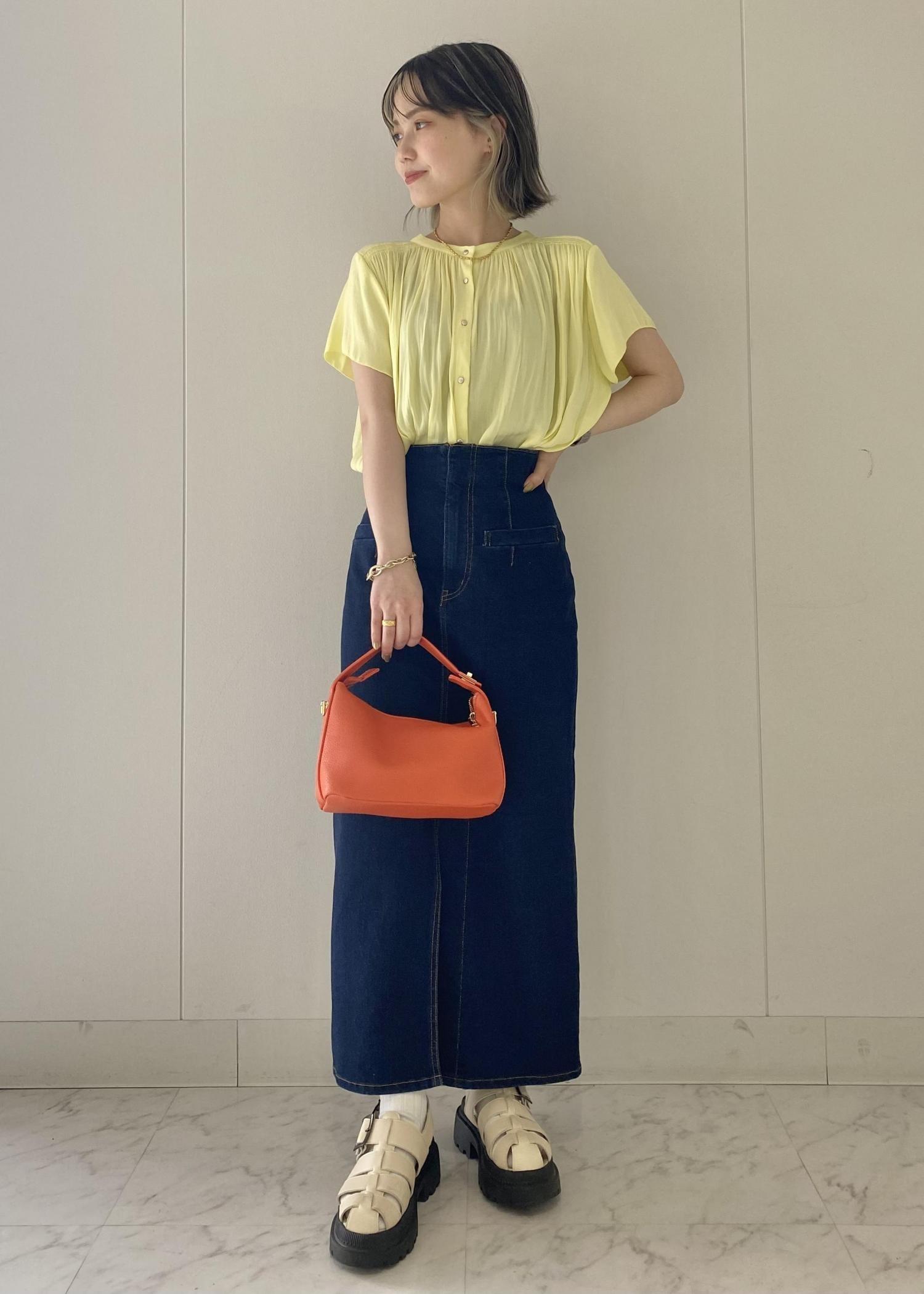 とろみのある柔らかな質感のブラウスをハイウエストのタイトデニムスカートにイン!シルエットにメリハリをつけてスタイルアップを叶える◎