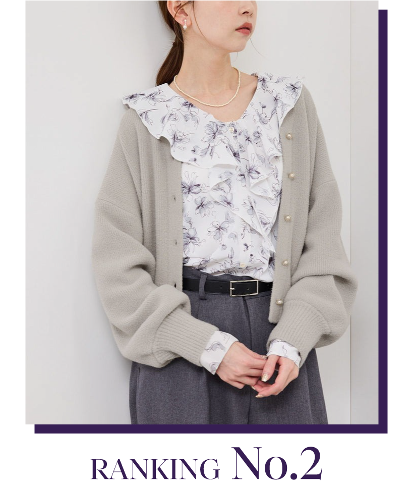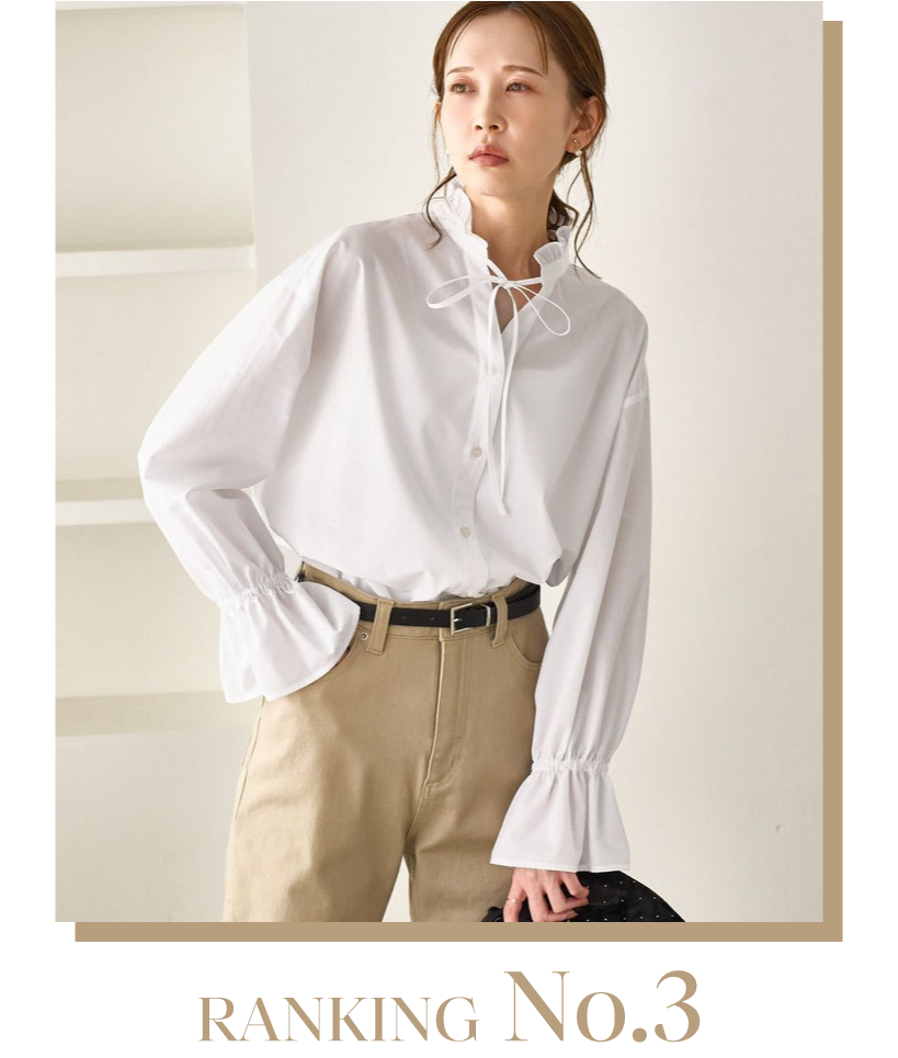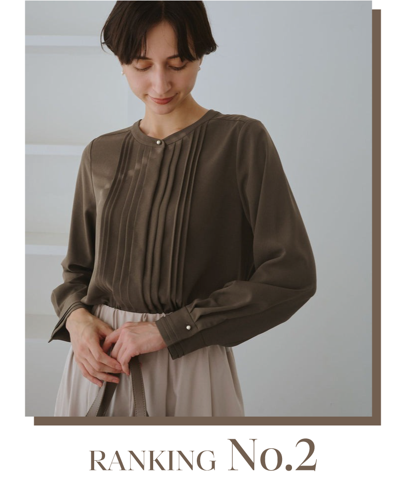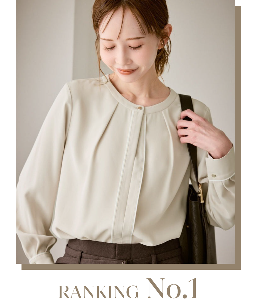 センターのラインがすっきりした印象を与えてくれて、1枚着でもパイピングがアクセントに。通勤や食事会、フォーマルな場にも馴染むアクセサリー不要のブラウスが1位にランクイン。ジャケットのインナーとしてオフィスカジュアルにはもちろん、ロングスカートを合わせて普段使いも◎。