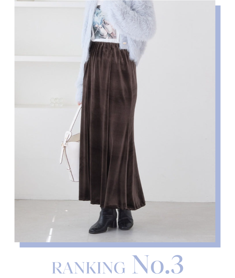 カットベロアを使用したマーメイドに近いナローシルエット。腰回りはすっきりデザインで下に向かって少し広がりがあります。内側のゴムでウエスト周りがすっきりキレイ!かつストレスフリーな着心地です。
