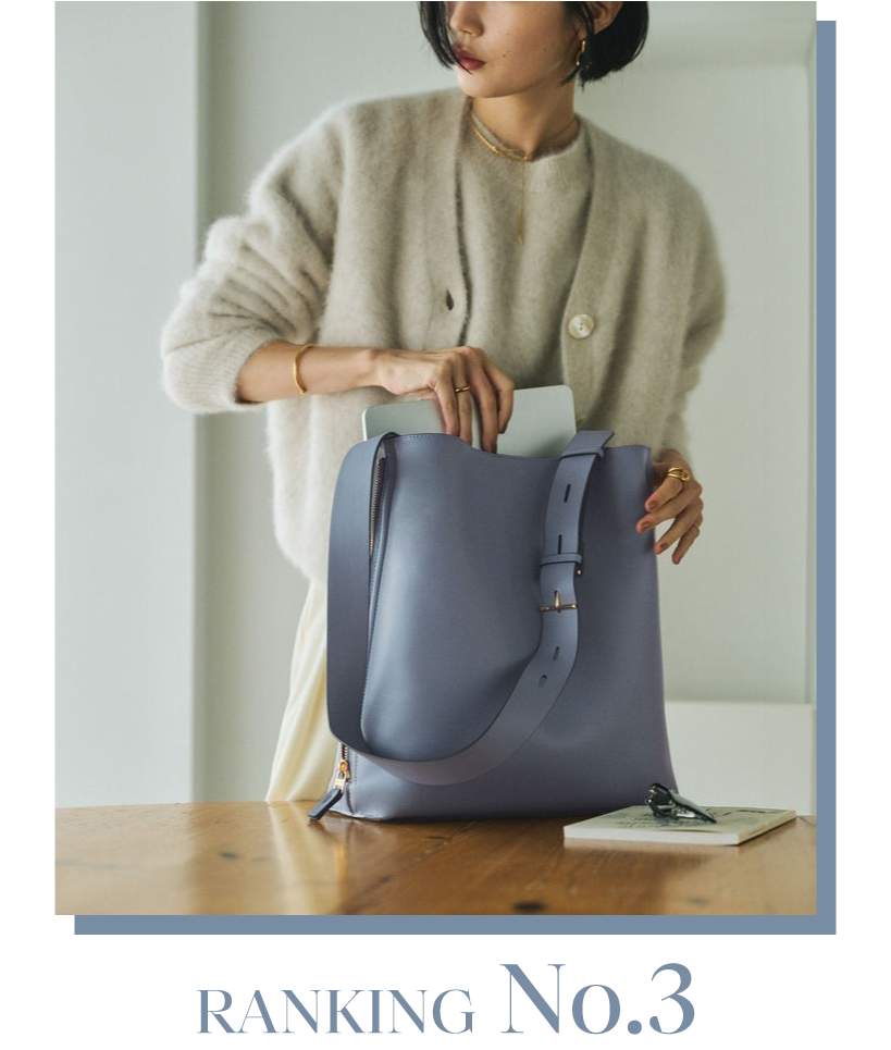 通勤やビジネスシーンに最適な縦型トートバッグ。内部は整理しやすい3分割構造で、荷物の定位置を確保。13インチPCやA4書類も収まります。縦型なので、電車やバスで座っている時も自分の膝元に収まり、周囲の邪魔になりません。