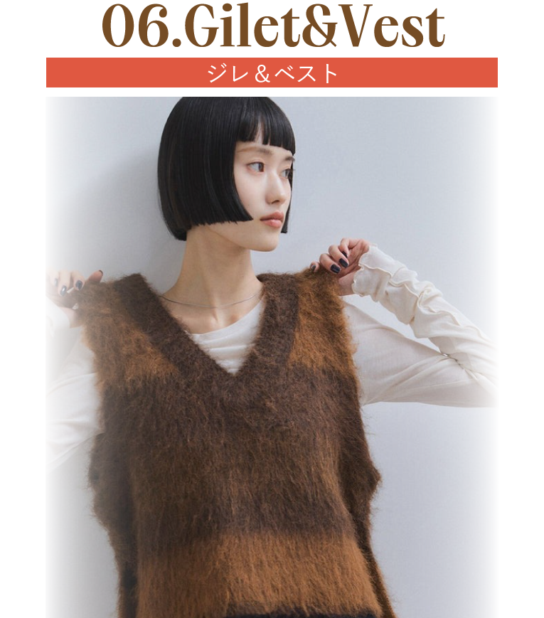 お手持ちのトップスに重ねるだけで旬のムードを演出できるジレ&ベスト。デザイン性と実用性を兼ね備えた、季節の変わり目に頼れる一枚。
