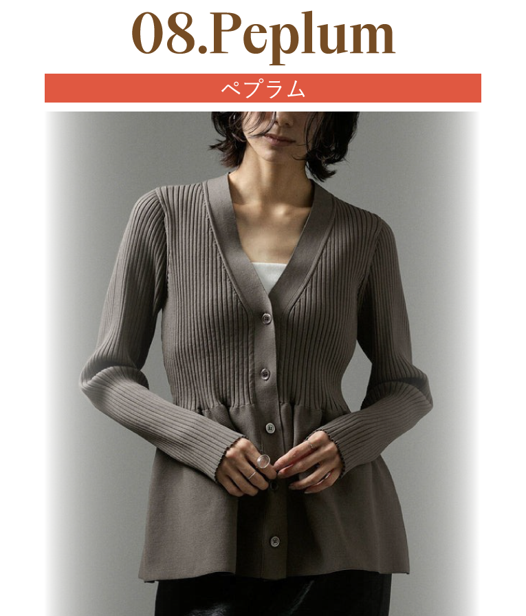 ウエストラインが女性らしいシルエットを作るペプラムトップス。1枚でフェミニンな印象を演出し、自然にスタイルアップを叶えます。