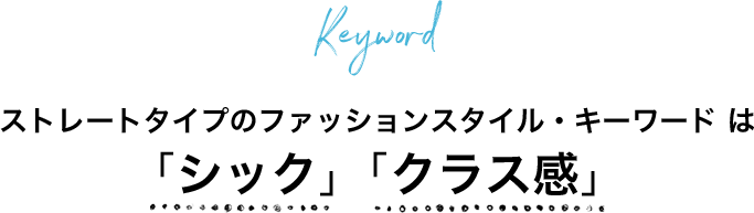 STRAIGHT TYPE 2022.11.18 厚みを感じさせる グラマラスなメリハリボディ ストレートタイプ 骨格診断 ストレートの人は、全体的に立体感があり、筋肉も感じさせるメリハリのあるボディを持っています。どちらかというと上重心。肌に弾力とハリがあるのも特徴です。 骨格診断 ストレートタイプの特徴は「上重心」「グラマラス」「メリハリボディ」がキーワード。ハリのある質感を持っているので、身につけるものも厚みがあり、ハリがあってシンプルなデザインをセレクトするのが正解。また、正統・高品質を意識したクラス感のあるコーディネートを心がけましょう。引き算スタイルも得意なので、過度な装飾は避けてシックにまとめるとおしゃれ感がアップします。 骨格ストレートのスタッフスタイリングをチェック VIS 札幌アピア ゆづき☺︎ ( 153cm) VIS ジョイナス横浜 yu ( 157cm) VIS タカシマヤゲートタワーモール Momona ( 158cm) VIS タカシマヤゲートタワーモール 虹 ( 153cm) VIS タカシマヤゲートタワーモール 虹 ( 153cm) VIS 本部スタッフ _ichi ( 154cm) VIS ルミネ大宮 yuka ( 152cm) ROPÉ PICNIC アミュプラザ長崎 teraoka ( 155cm) VIS 銀座インズ2 MIREI ( 164cm) OUTLET 神戸三田プレミアム・アウトレット のん ( 159cm) ROPÉ PICNIC アミュプラザ長崎 teraoka ( 155cm) VIS 銀座インズ2 yuna ( 160cm) VIS 鹿児島山形屋 NAGOMI ( 166cm) VIS 鹿児島山形屋 NAGOMI ( 166cm) VIS ルミネエスト sara ( 165cm) VIS 天神地下街 ももこ ( 157cm) VIS ルミネエスト sara ( 165cm) VIS ららぽーと横浜 オガ ( 156cm) VIS 銀座インズ2 MIREI ( 164cm) VIS 銀座インズ2 KAYO. ( 160cm) ROPÉ PICNIC アミュプラザ長崎 teraoka ( 155cm) VIS 天神地下街 CHIHARU ( 157cm) VIS ららぽーと横浜 ayako ( 157cm) VIS ららぽーと横浜 ayako ( 157cm) VIS 銀座インズ2 KAYO. ( 160cm) VIS ららぽーと横浜 n ( 155cm) VIS アトレ大井町 eri ( 157cm) ROPÉ PICNIC アミュプラザ長崎 teraoka ( 155cm) OUTLET 鳥栖プレミアムアウトレット maki ( 158cm) VIS 二子玉川ライズ ayu ( 162cm) ストレートタイプのスタッフスタイリングをチェック 骨格ストレートをもっと見る 骨格ストレートにおすすめのアイテムはこちら もっと見る 骨格診断TOPに戻る 自分に本当に似合う一着はどれ?骨格タイプ&パーソナルカラーで探す初夏のワンピース 一着で旬なコーディネートが完成する夏のワンピース。主役になるアイテムだからこそ、着こなしのバランスや印象の良し悪しを大きく左右します。そこで大切なのが、自分の骨格タイプやパーソナルカラーに合ったものを選ぶということ! 最適な選び方を教えてくれるのは、骨格診断の創始者で、パーソナルカラー診断のスペシャリストである二神弓子先生。さまざまなデザインがラインナップする初夏のワンピースを、「ストレート・ウェーブ・ナチュラル」の3つの骨格タイプ、さらに「イエローベース・ブルーベース」の2つのパーソナルカラー別に分類。選び方の基準や着こなしのコツを取り入れ、理想的な夏スタイルを目指しましょう。 骨格タイプ・ストレートに似合う!初夏のおすすめワンピース 体にグラマラスな厚みや立体感があるストレートタイプには、着痩せ効果のある“Iライン”のワンピースがおすすめ。 リラクシーなロングワンピは、身幅が広すぎないものを選びましょう。深めのVネックやスタンダードなクルーネックは、ボリュームのある上半身をすっきりと見せてくれます。素材は凹凸感を抑えた、フラットでハリのあるものが最適。上品さやクラス感、さらにパーソナルカラーも意識し、メリハリボディを最大限に活かして。 骨格タイプ&パーソナルカラーで選ぶ! 自分にぴったりの春夏の最新トレンドアイテム 最近ファッション記事でよく見かけるようになった「骨格タイプ」や「パーソナルカラー」。自分自身の骨格や肌色のタイプを知り、ちょっとした丈感やシルエット、色のニュアンス選びを工夫するだけで、好みの服を“似合うアイテム”として取り入れることができます。 今回は、各ブランドから発売された春夏新作を、骨格診断の創始者で、パーソナルカラー診断のスペシャリストである二神弓子先生がジャッジ。「ストレート・ウェーブ・ナチュラル」の3つの骨格タイプと、「イエローベース・ブルーベース」のパーソナルカラーで振り分け、それぞれ着こなし方のポイントを指南していただきます。 骨格タイプ・ストレートに似合う!春夏のおすすめ最新作 骨格自体にグラマラスな華やかさがあり、“引き算”した着こなしが似合うストレートタイプ。トレンドに左右されすぎないベーシックなものを選び、シンプルに勝負するのがおすすめです。 トレンド要素を取り入れたいときは、主張しすぎずさりげなく、が必須条件! きちんと感のある素材で上品なクラス感を意識し、サイズ感や丈はジャストを選んで“Iライン”をつくると、メリハリのある骨格を活かしたスタイリッシュな装いが叶います。 この春着たいトレンドアウターが勢揃い! 骨格タイプ&パーソナルカラーで理想の一着に出会う! 少しずつ暖かくなり、そろそろ新し