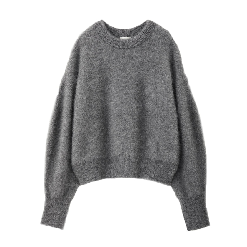 猫のお腹に顔を埋めた時のような至福を味わう事のできる、フォックスとラクーンの糸を使用した軽くふわふわで暖かな肉感の贅沢生地。顔まわりを優しくすっきりと見せてくれる幅厚のラウンドネック。ボトムとのバランスをとりやすいリラックスシルエット。腕を捲った時に腕周りはふんわり、手首はすっきりと見せてくれる袖周り。まさしく憧れていた女性像を体現するための究極のグレーニット!何年先も手入れをしながら大切に着ていきたいと思います。