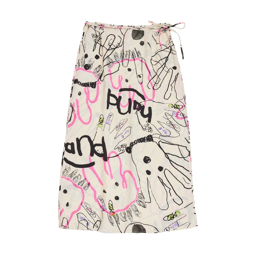 伸びやかな大小さまざまの線に、ラフなタッチで描かれた手。クリームカラーのスカートに映えるド派手デザインは、子供たちが自由に描いたハンドライティングアート!1枚加えるだけで普段のスタイリングが一段と垢抜けること間違いなし。子供たちの自由さを見習って、こちらのアイテムも自由に合わせたい!キレイめスラックス、ゆったりデニム、オーバーサイズのジャケット、ざっくりニット・・・妄想が止まりません!