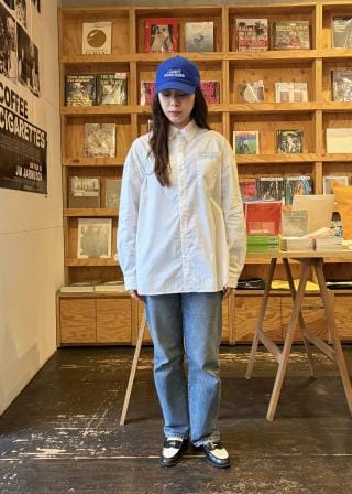 遊び心のある「I DON’T WORK HERE」のブルーのキャップをアクセントに締めました。