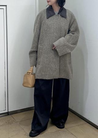 コートのボリュームを活かして、ストンとしたボトムやIラインワンピースに合わせるスタイルがおすすめ。