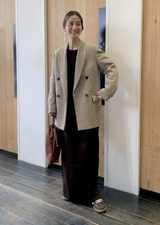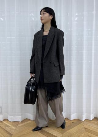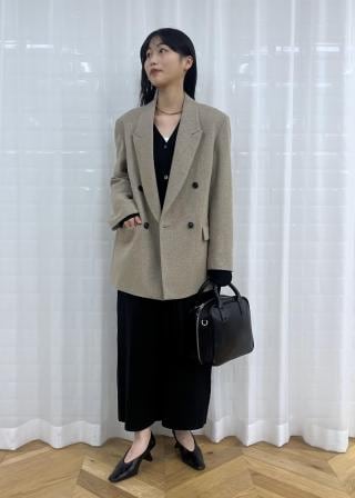 柔らかな色と素材感でありながら、ダブルブレストとピークドラペルのディティールを取り入れることで、マニッシュにも着用できるアイテムに。