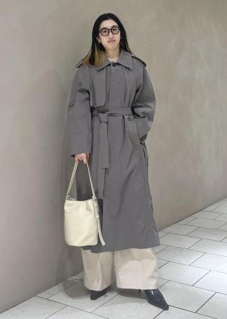 マニッシュなトレンチディティールを取り入れ、袖のカーブしたフォルムやたっぷりとした生地の分量感など、女性らしさも大切にしたスプリングコート。