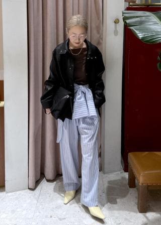 トップスをインしてくしゅっとさせたフロントの生地感を見せる着こなしも素敵。
