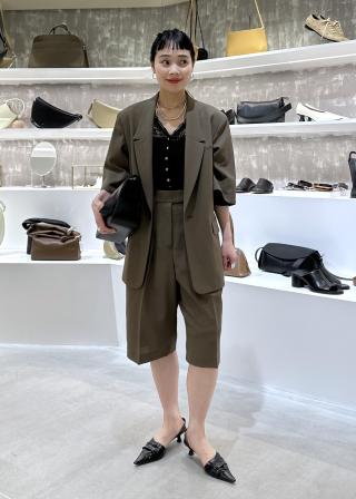 ショート丈で様々なボトムに合わせやすく、デニムでカジュアルダウンさせるスタイルもおすすめ。