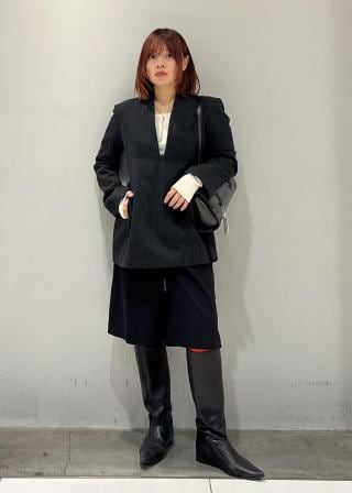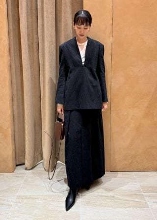 マニッシュな空気感の中に女性らしさを残したデザインで、モードな空気感が漂う一着。