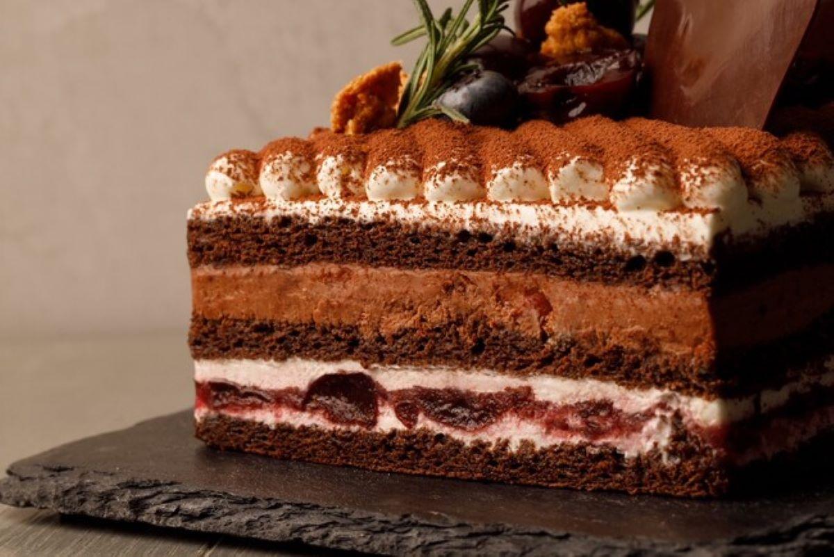ココアのビスキュイでクレームショコラとキルシュのシャンティをサンド、サワーチェリーとグリオットチェリーのコンポートをしのばせました。