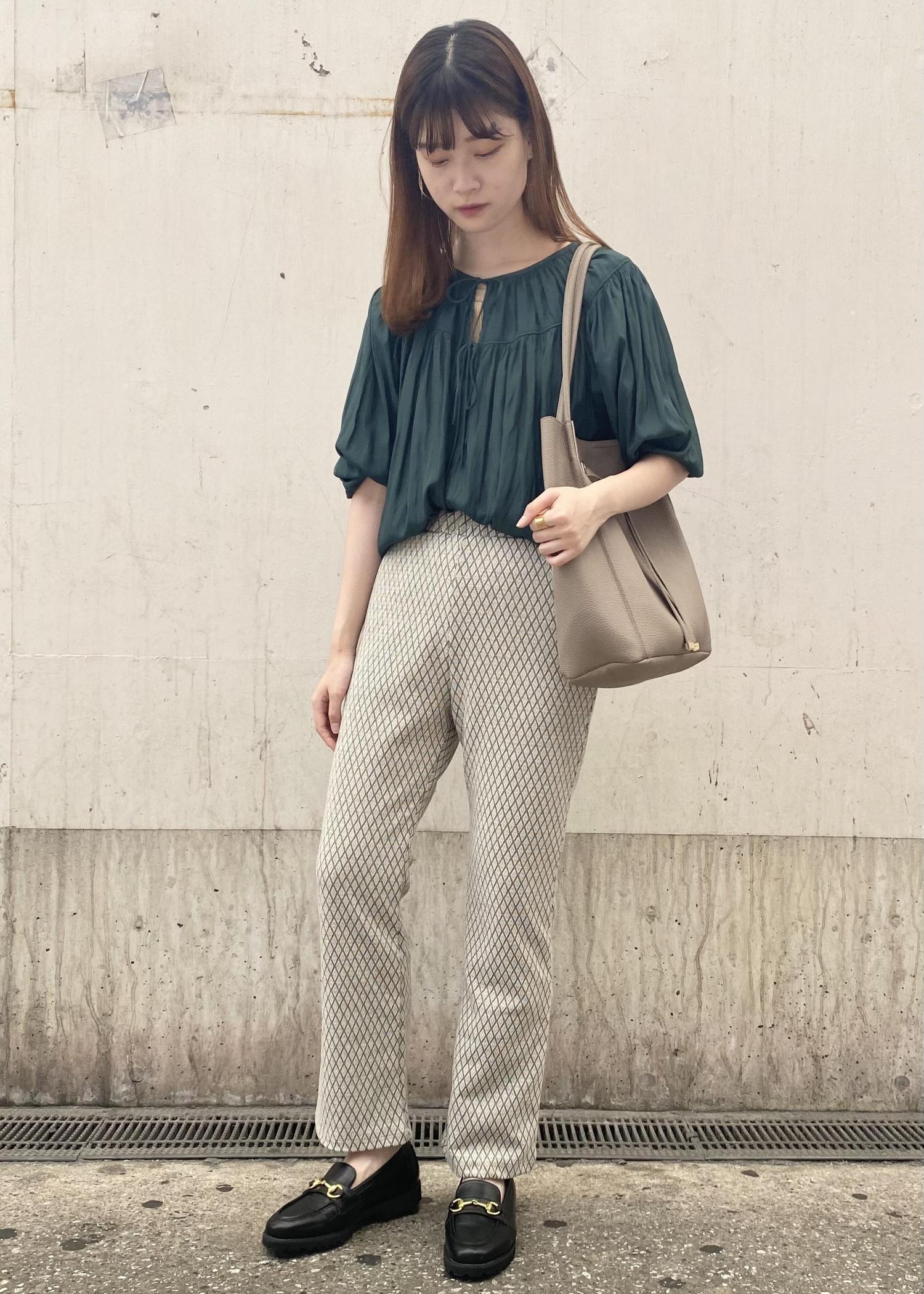 秋にも着れるグリーンのブラウスをメインにコーディネートしました♪ パンツもグリーンが入ってるものにすると統一感が出ます! フレアパンツにトップスをインすると全体的なシルエットもスッキリして見えますよ◎