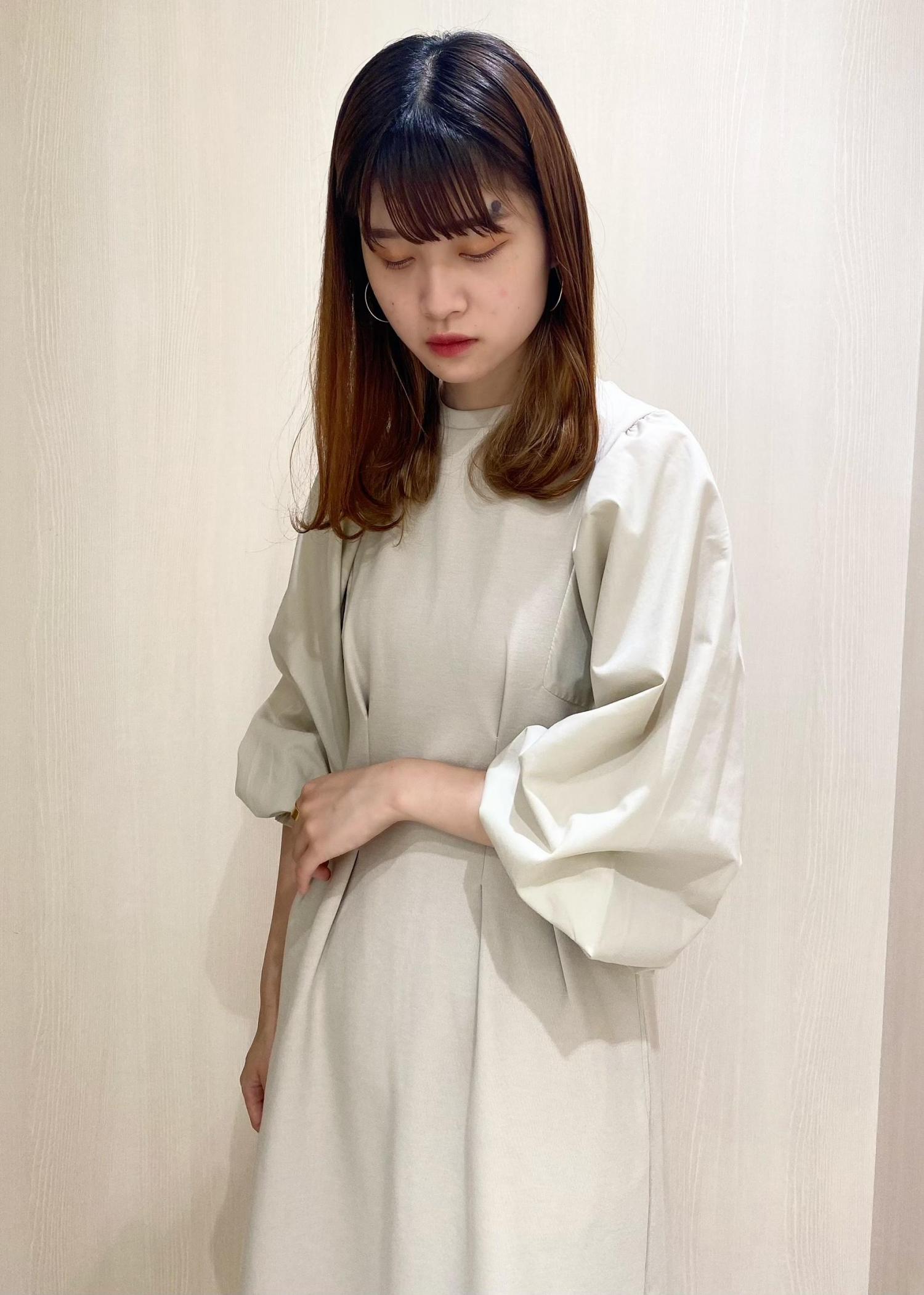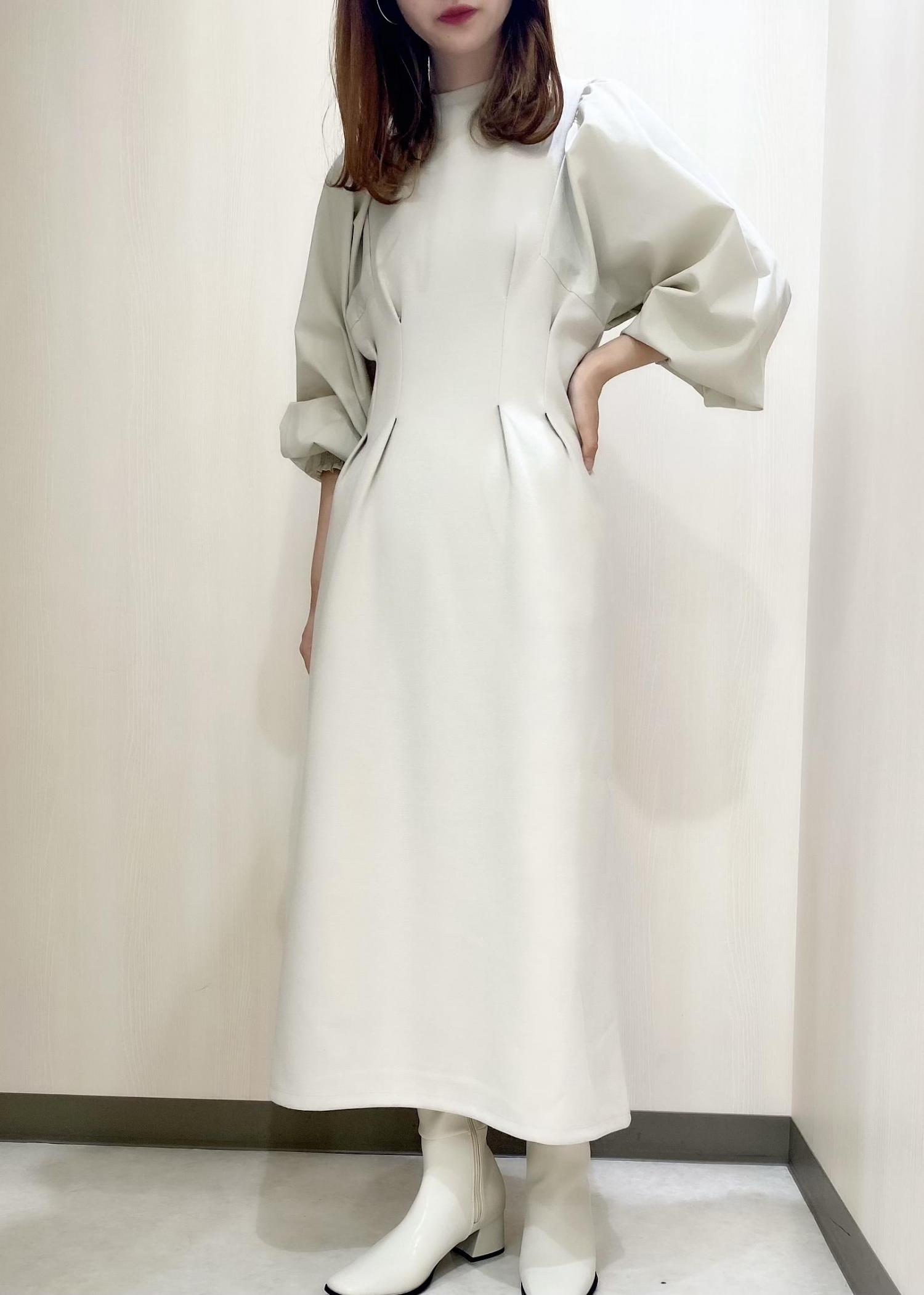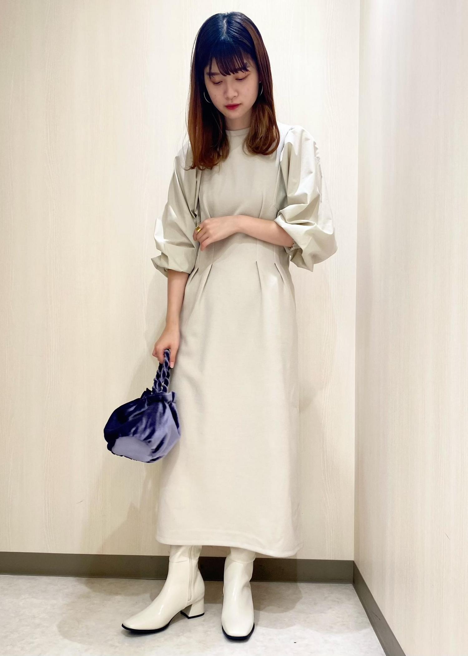 トレンドのボリュームスリーブのワンピースとロングブーツでコーディネートしてみました♪ ワンピースとブーツを白でまとめたのでバッグは特徴的なベロアのミニバッグを合わせてしめました☺︎
