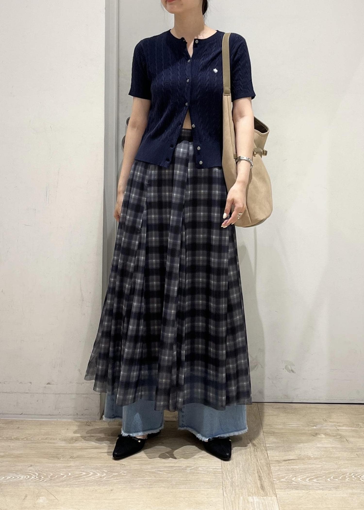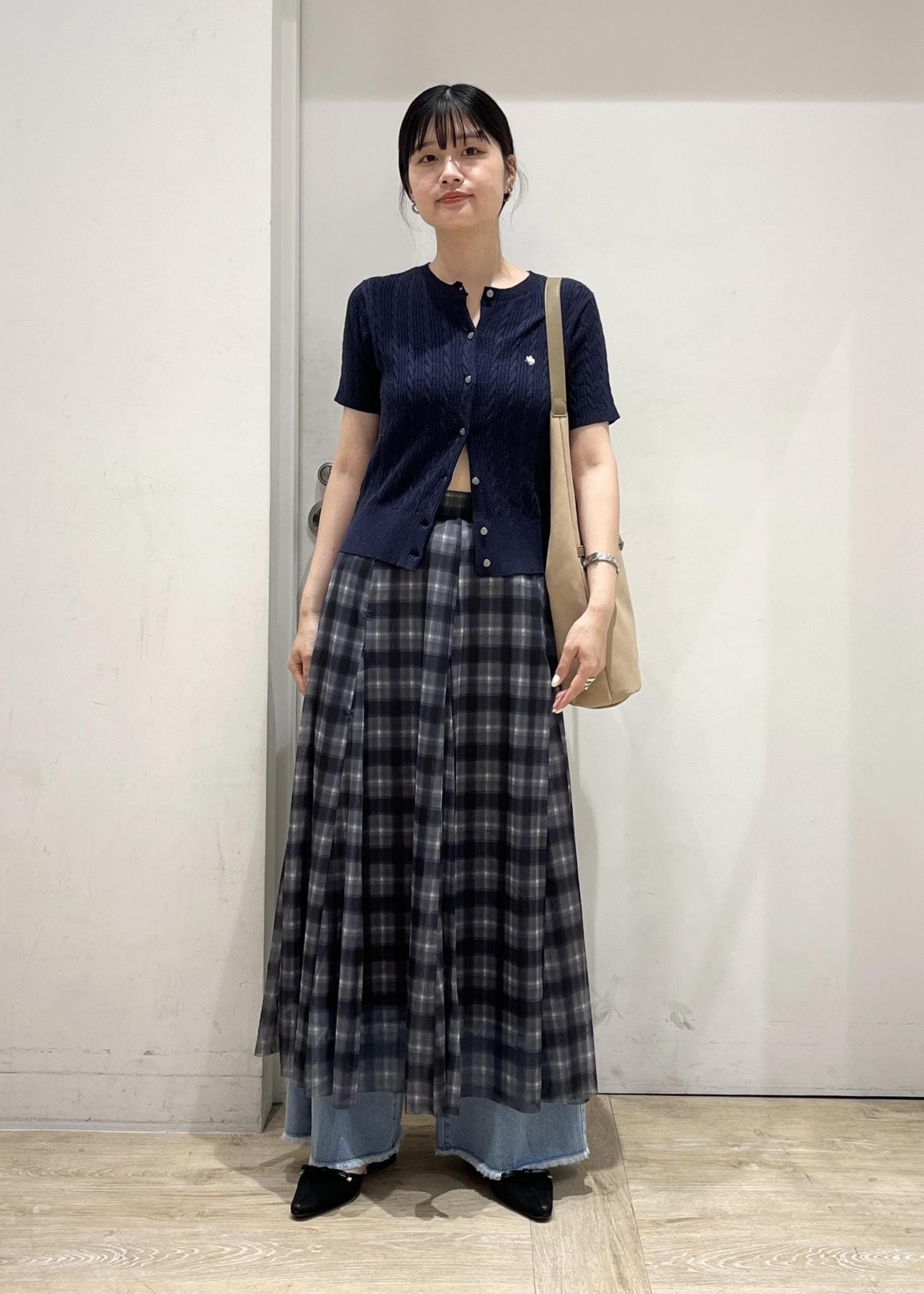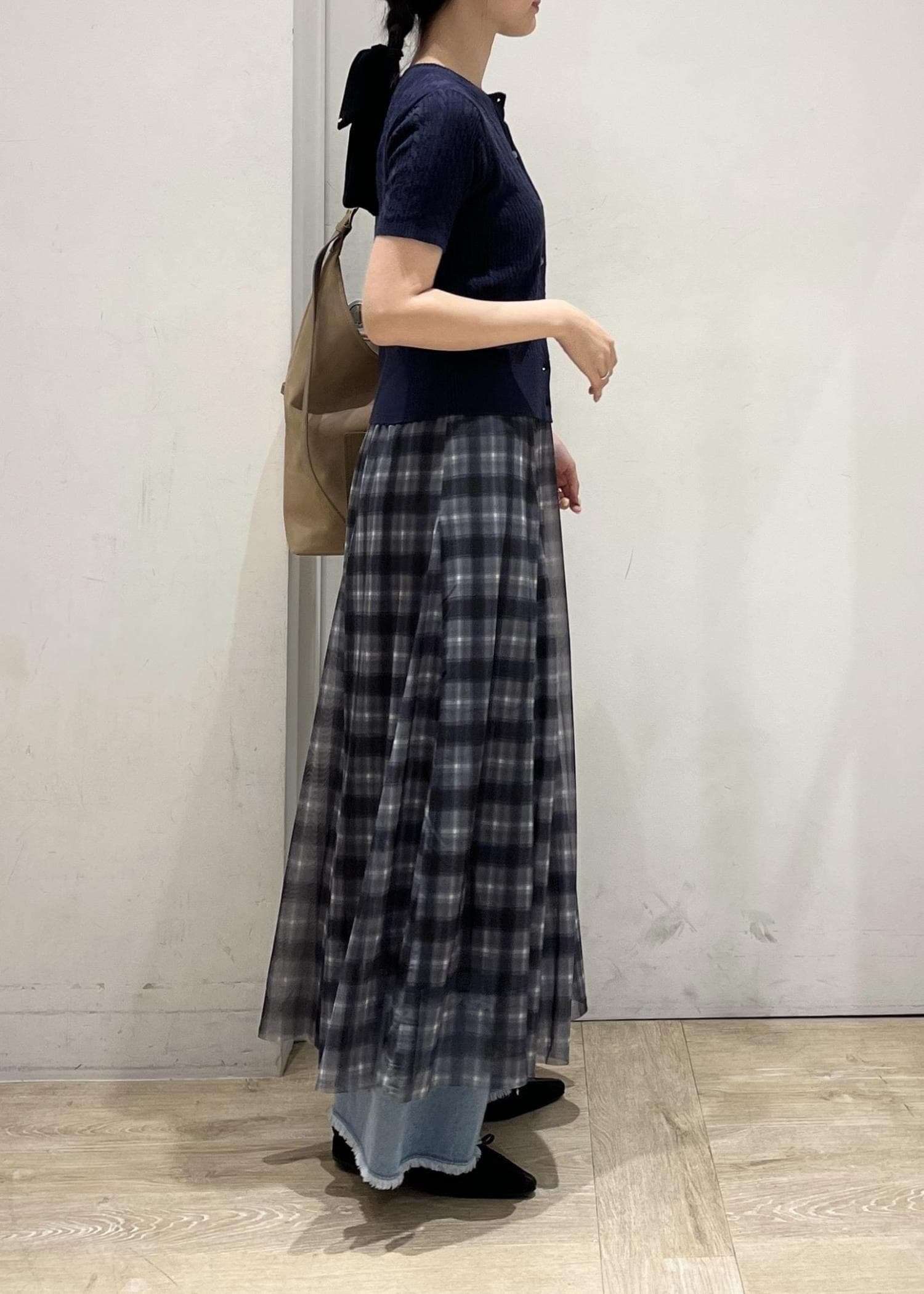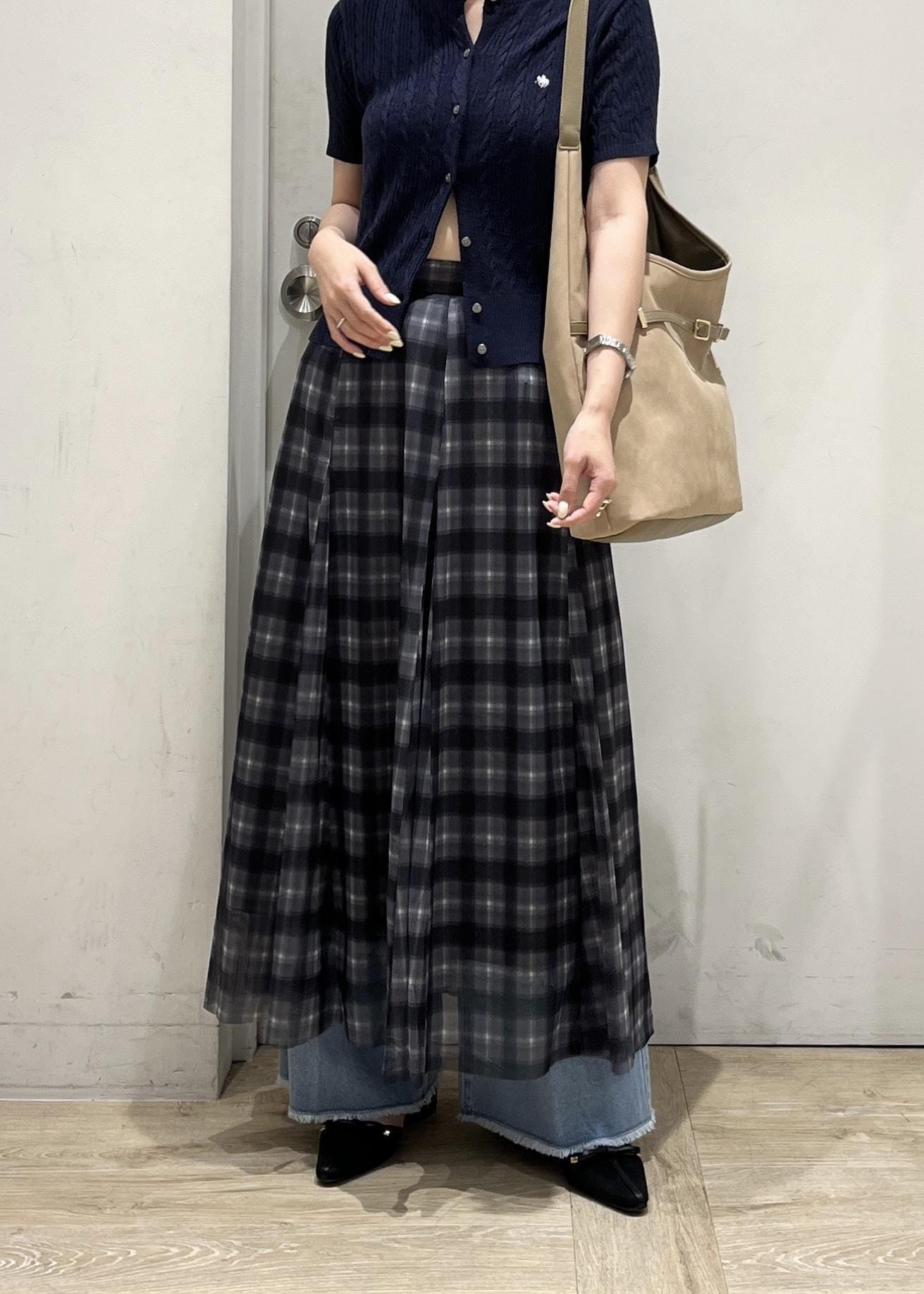 アウトレットVIS【洗える】チュールプリントチェックスカートブラック系 / F¥4,612レビュー身長164cmですねくらいの丈感。