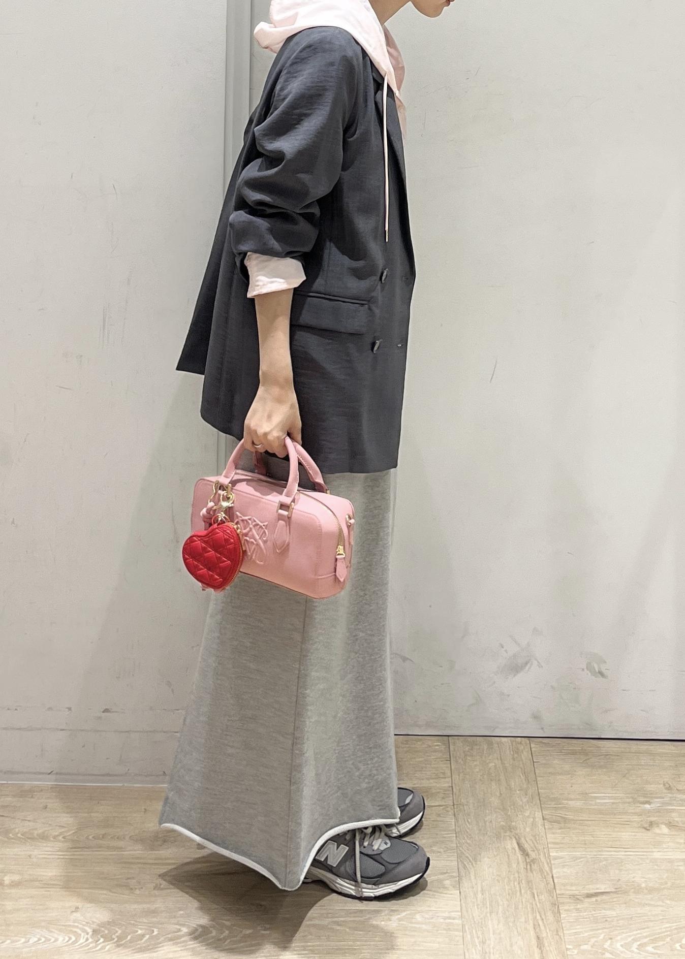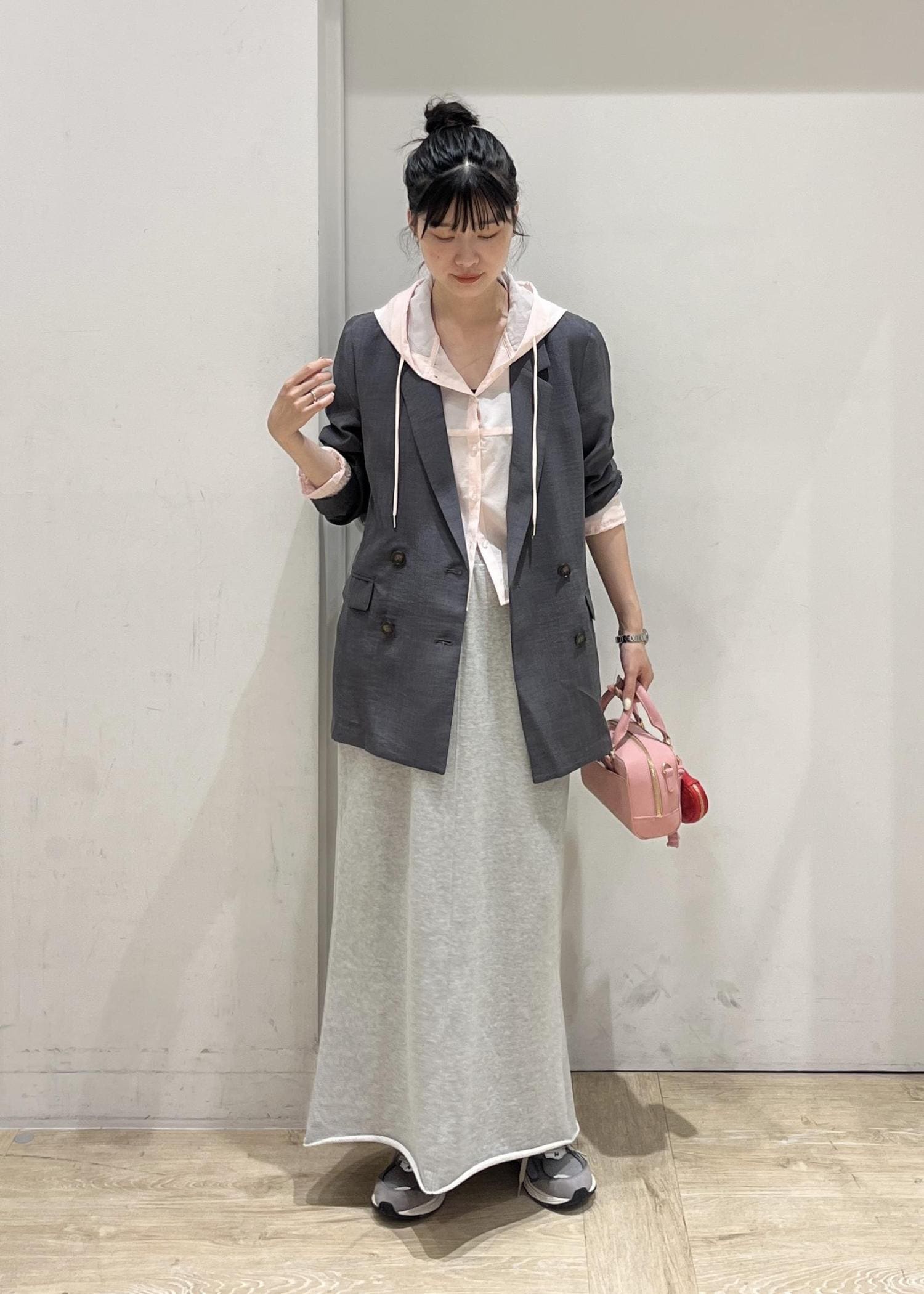 グレー×ピンクの組み合わせが、女性らしさもあるコーディネートに。
